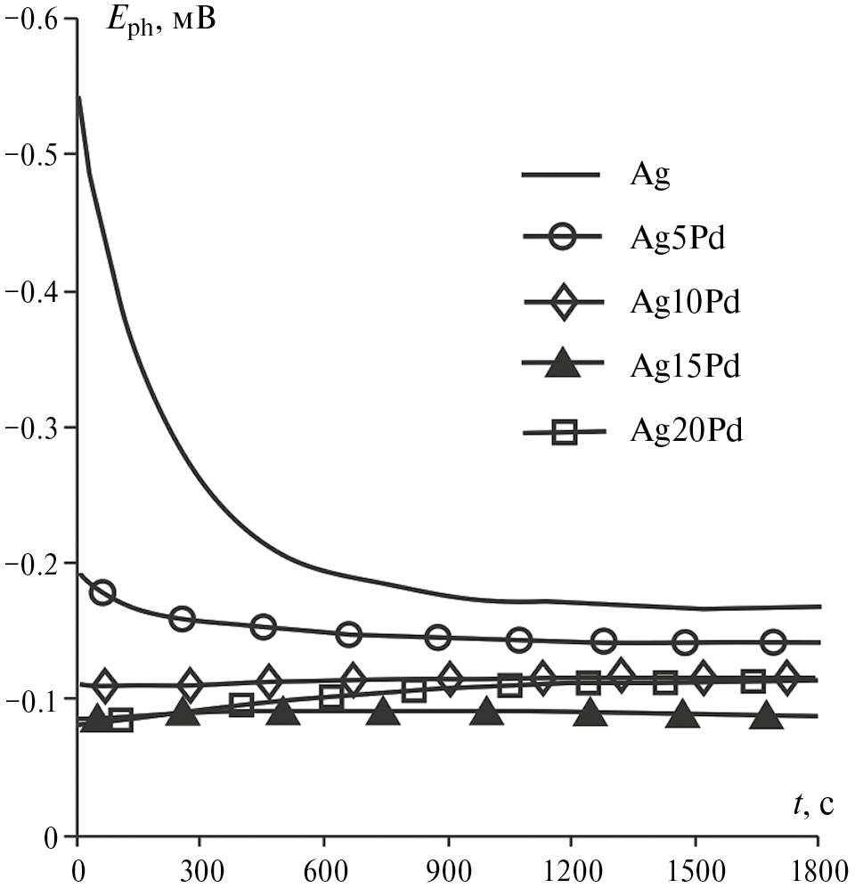 Для чистого серебра наблюдается снижение абсолютного значения фотопотенциала во времени, что может указывать на уменьшение толщины анодно сформированной пленки оксида Ag(I) за счет ее химического растворения [31]. Но уже на сплаве с минимальным содержанием палладия тенденция к уменьшению фотопотенциала практически отсутствует, т. е. химическая устойчивость оксидной пленки повышается при увеличении в ней доли оксида палладия. Как начальные значения фотопотенциала оксидной пленки, так и его стационарные значения тем ниже, чем больше концентрация палладия в сплаве.