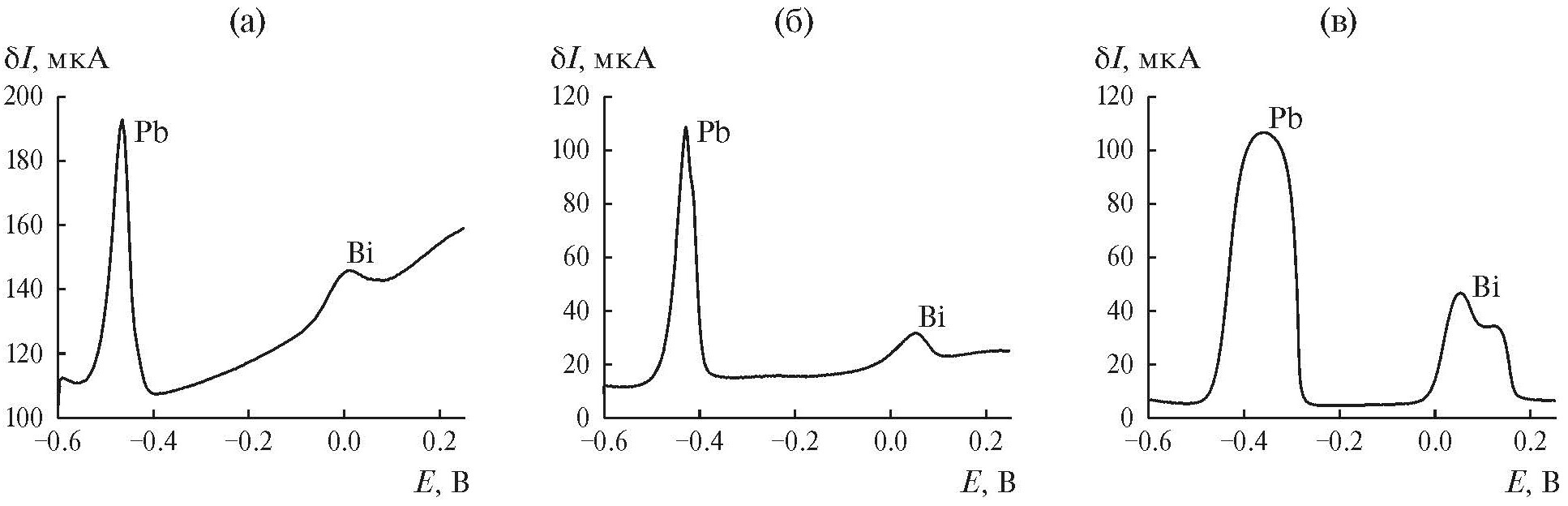 На полученных вольтамперограммах (рис. 1) при более отрицательных потенциалах (−0.5 … −0.4 В) наблюдается пик растворения свинца, а при более положительных – пик растворения висмута (0.0–0.1 В). Однозначно зарегистрировать анодные пики растворения свинца и висмута оказывается возможным при следующих параметрах квадратно-волновой инверсионной вольтамперометрии: потенциал электроконцентрирования −0.6 В, время электроконцентрирования 150 с, время очистки электрода 100 с (рис. 1б). Электроконцентрирование при более отрицательных потенциалах рабочего электрода приводит к значительному выделению водорода, который помимо уменьшения выхода по току блокирует поверхность осадка и препятствует воспроизводимому проведению анализа. При слишком малой продолжительности концентрирования (60 с) пик висмута на низких концентрациях становится сопоставим с фоновым током, и его количественный анализ затрудняется (рис. 1а). При увеличении времени концентрирования до 300 с пики начинают уширяться (рис. 1в). Экспериментально подтверждено, что появление двойного пика при растворении висмута не связано с наличием в растворе ионов свинца. Подобное поведение наблюдалось в литературе ранее [27].