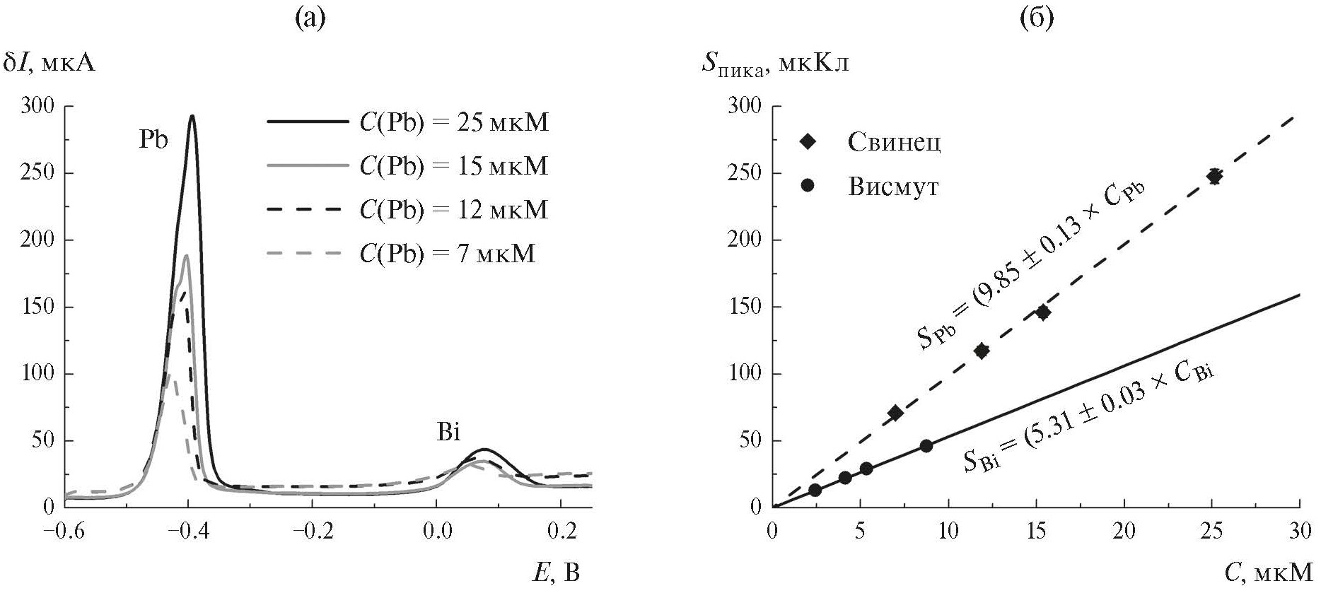 На рис. 2б изображены градуировочные зависимости площадей пиков для висмута и свинца. Они имеют линейный вид, минимальные определяемые концентрации, рассчитанные по 6S-критерию (формула (1)), для обоих металлов составляют 80 нМ.