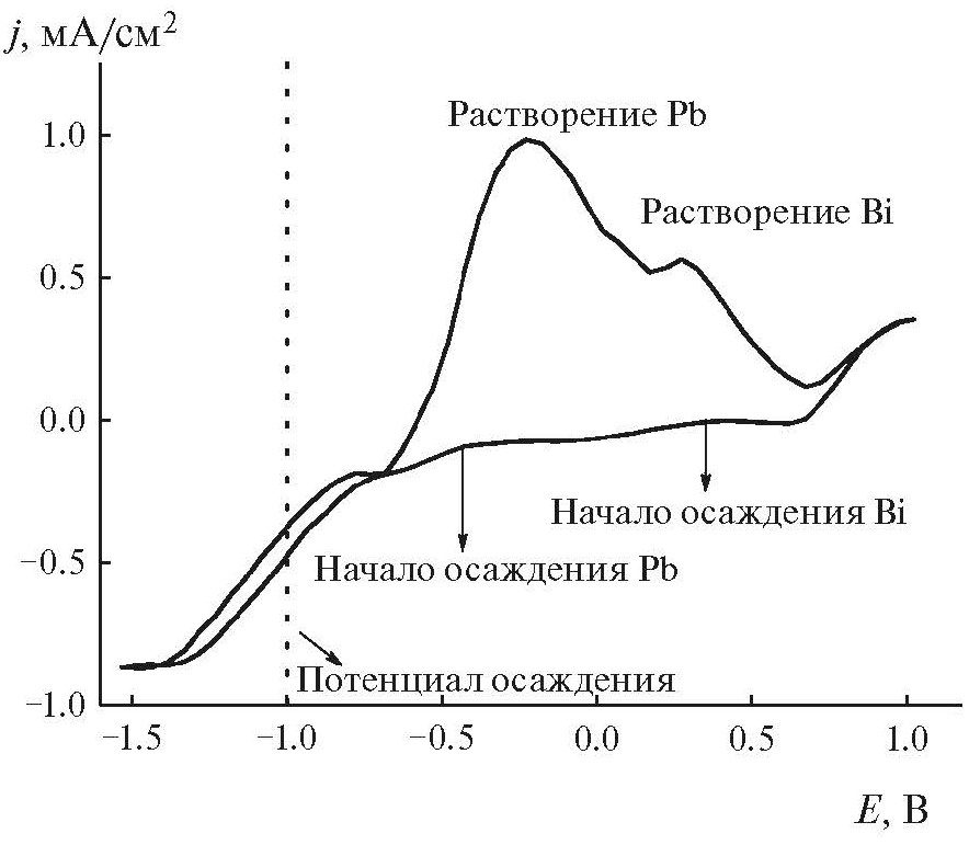 Для выбора оптимальных условий электроосаждения сплавов Pb–Bi была проведена циклическая вольтамперометрия (ЦВА) раствора электролита, имеющего состав 18.4 мМ Pb(NO3)2, 0.8 мМ Bi(NO3)3, 24.6 мМ ЭДТА-Na2 и 625 мМ NaNO3 (рис. 3). Согласно ЦВА, висмут начинает осаждаться при потенциале 0.35 В, выходя на предельный диффузионный ток. При потенциале –0.4 В в системе дополнительно протекает осаждение свинца. Для того чтобы обеспечить электрокристаллизацию обоих металлов с заметной скоростью, в данной работе был выбран потенциал осаждения, равный –1 В.