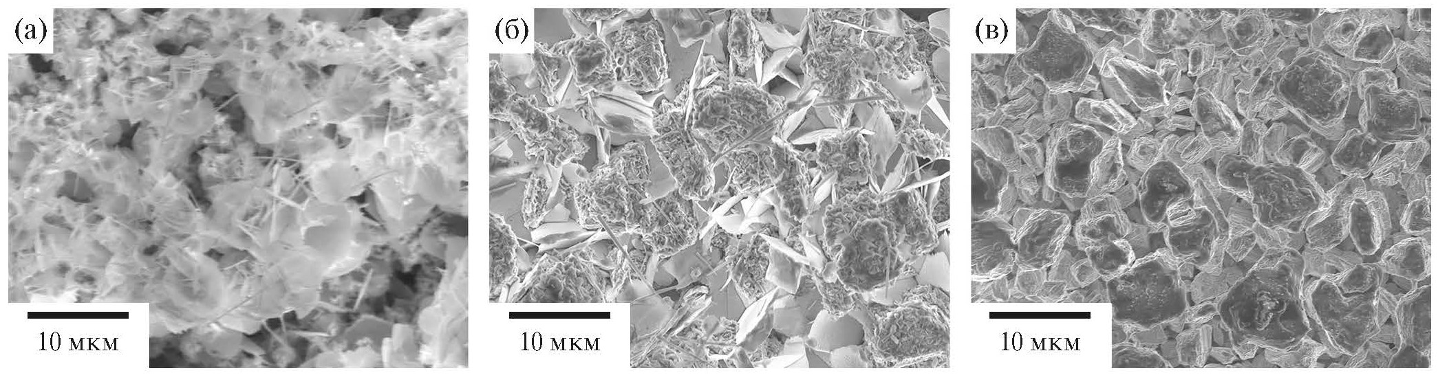 Рис. 6. Изображения, полученные методом растровой электронной микроскопии, для образцов, содержащих Bi, ат. %: 77 (a), 33 (б) и 22 (в)