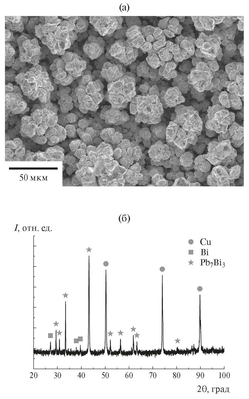 Фазовый состав наиболее однородных по микроструктуре осадков был изучен методом рентгенофазового анализа. На рис. 7б представлена рентгенограмма образца, содержащего 27 ат. % Bi, осажденного на медную подложку. В образце преобладает ε-фаза, также наблюдаются пики медной подложки и фазы висмута. Несовпадение наблюдаемых в образце фаз с предсказанными фазовой диаграммой может объясняться тем, что рост осадка происходит в неравновесных условиях, в то время как фазовая диаграмма описывает состояние равновесной системы. В то же время полученные результаты говорят о том, что электроосаждение позволяет получить ε-фазу, обладающую наиболее интересными электрофизическими свойствами в системе Pb–Bi.