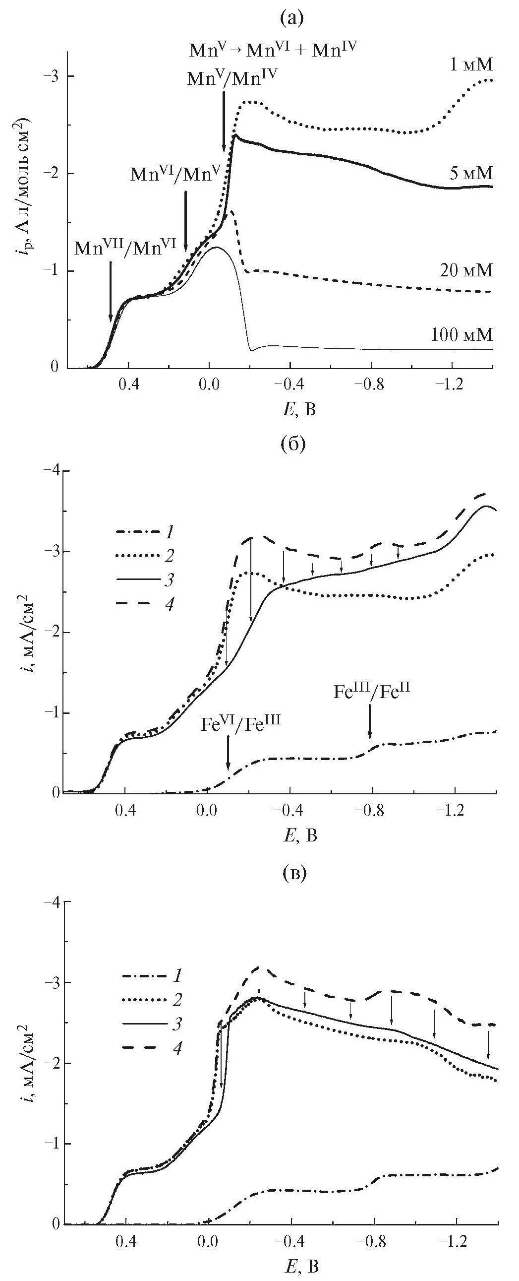При одновременном присутствии K2FeO4 и KMnO4 в растворе (рис. 1б, кривая 3) положение первых двух волн перманганата практически не изменяется, в то время как третья волна сдвигается в сторону отрицательных значений и меняется наклон в области ее предельного тока. Сдвиг может быть обусловлен изменениями локальных концентраций участвующих ионов и скоростей протекания химических стадий. Например, FeVI и MnV могут взаимодействовать, что приведет к изменению общей скорости процесса по аналогии с MnVII и MnV [22]. Ток в смешанном растворе (кривая 3) оказывается ниже суммы токов (кривая 4) восстановления индивидуальных анионов в области потенциалов отрицательнее 0 В (указано стрелками). Усиление ингибирования может быть обусловлено торможением восстановления феррата(VI) осаждающимся оксидом марганца. Однако в области (0 … –0.3) В снижение оказывается существенно больше значения тока индивидуального феррата(VI), что указывает на взаимное ингибирование обоих процессов.