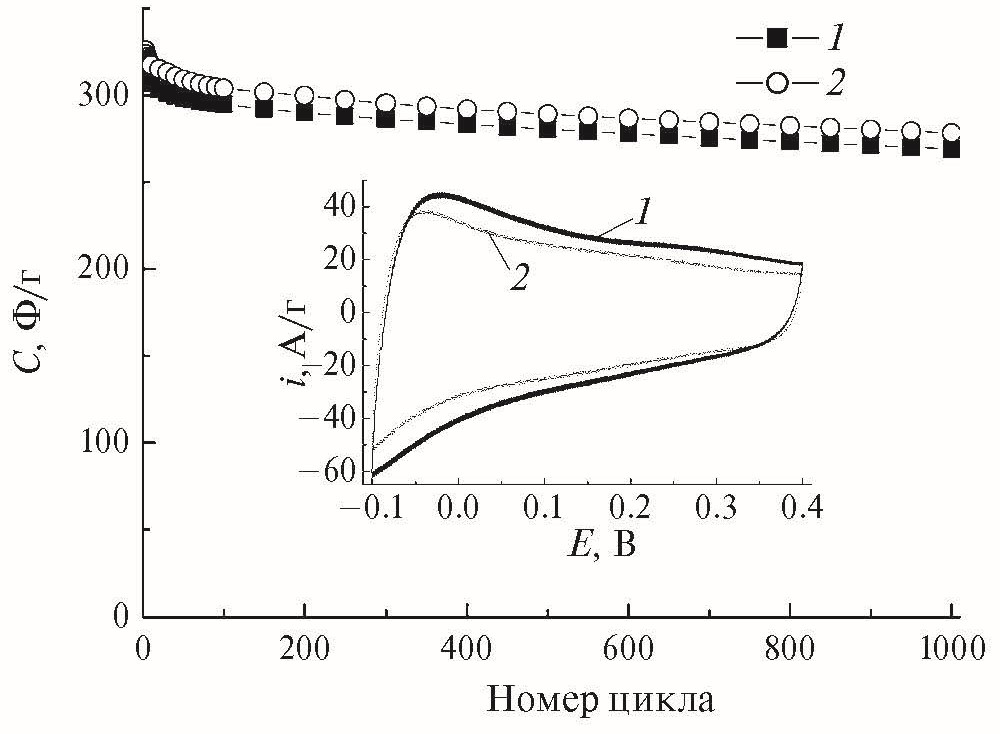 Выявленное изменение потенциала перезаряжения (рис. 7а) указывает на возможность управления электрохимическими свойствами самого оксида. Ранее этот эффект не был показан, так как отклики синтезированных бирнесситов обычно зарегистрированы в узком интервале потенциалов [11, 12], а изменение наклонов различных участков кривых при допировании не может являться надежным свидетельством изменения их электрохимических свойств при измерениях в слабо забуференных средах [36]. Улучшение перезаряжаемости за счет изменения потенциала для допированного материала оказывается возможно только при измерении в области средних величин (–0.1 – 0.4) В (рис. 8, врезка). Удельные емкости С и заряды получены путем интегрирования нормированных на скорость развертки и md вольтамперограмм. Более подробно эта процедура описана в работе [36]. В области низких скоростей развертки (2–20) мВ/с величины С почти не меняются и составляют 386 Ф/г для исходного бирнессита и 403 Ф/г для полученного из раствора с с(Fe) = 0.3 мМ. Соответствующие удельные заряды равны 202 и 193 Кл/г. Полученные С близки к значениям для электрохимически осажденного бирнессита на различные подложки, составляющие обычно 300–400 Ф/г [38]. При увеличении скоростей развертки потенциала различие величин при допировании резко уменьшается, а интеркаляционные максимумы становятся слабо выражены. Допирование почти не влияет на стабильность бирнессита при циклическом перезаряжении (рис. 8) в области потенциалов его наибольшей устойчивости. Бирнесситы, осажденные из растворов с с(Fe) > 0.3 мМ, демонстрируют ухудшение удельных характеристик и стабильности при перезаряжении.