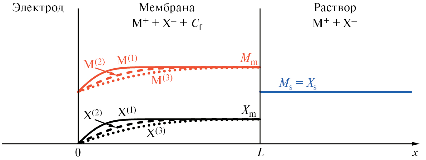 Рис. 1. Схема системы электрод/мембрана/раствор бинарного электролита. Показаны профили концентраций фоновых противоионов М (М(1), М(2) и М(3)) и электроактивных коионов Х (Х(1), Х(2) и Х(3)) для трех моментов времени после скачка потенциала: 0 < t(1) < t(2) < t(3).