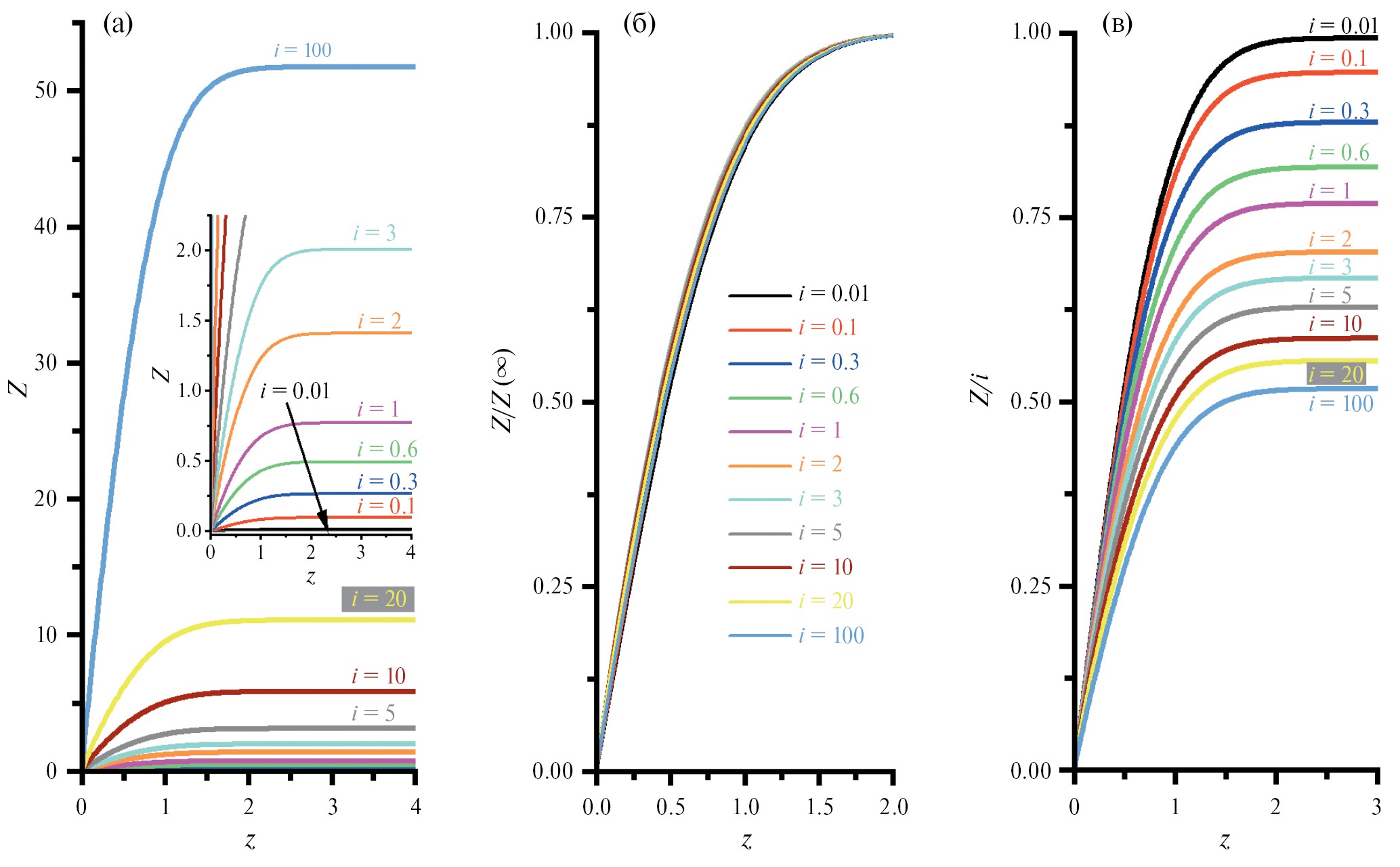 Другой результат на основе рис. 2а менее очевиден: во всем (очень широком) рассмотренном интервале значений параметра i форма кривой Z(z) остается практически постоянной: после линейного роста при малых значениях координаты z (много меньше 1) наклон начинает быстро спадать – с очень резким выходом на плато уже при значении координаты z, близком к 2.