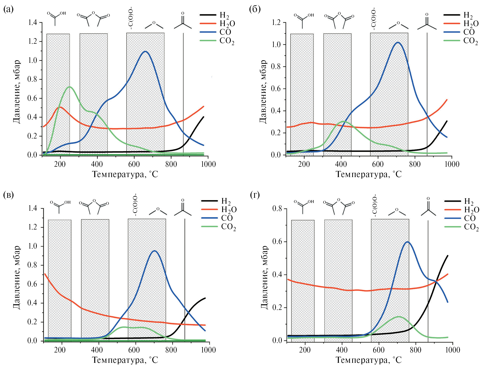 Термопрограммируемая десорбция. Согласно данным ТПД, в образце МУНТ-0 присутствуют карбоксильные ангидридные, эфирные, лактонные и карбонильные группы (рис. 4а). По мере увеличения температуры восстановления наблюдается последовательное изменение типа групп. Восстановление при 300°С приводит к удалению карбоксильных групп (рис. 4б), при 400°С исчезают ангидридные группы (рис. 4в), образец, восстановленный при 500°С, характеризуется преимущественно карбонильными группами (рис. 4г).