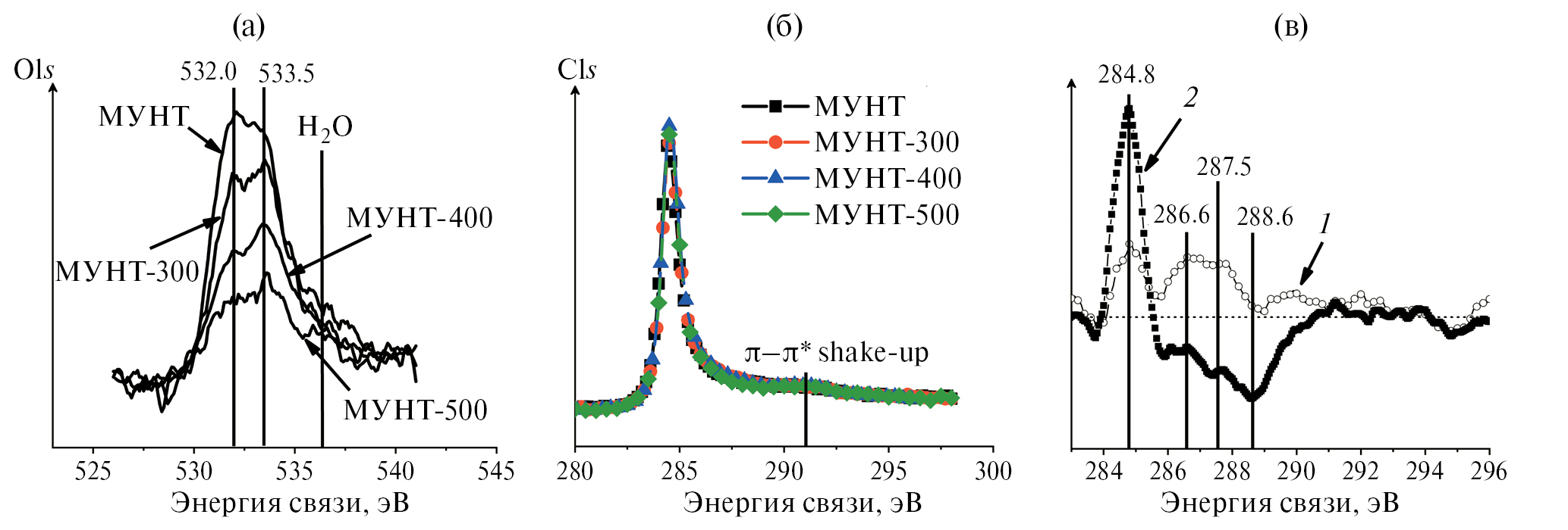 Содержание кислорода, связанного с углеродом, относительно мало: от 1 до 5 ат. %, и, ожидаемо, изменения формы спектров C1s минимальны (рис. 5б). Однако можно отметить, что последовательное повышение температуры восстановления увеличивает долю углерода с sp2-гибридизацией, что подтверждает данные КР-спектроскопии. Дополнительная оценка упорядоченности материала по интенсивности shake-up сателлита показывает падение доли неграфитных атомов углерода в ряду МУНТ-0 > МУНТ-300 ~ МУНТ-400 > МУНТ-500. При температуре восстановления 500°С происходит удаление карбонатных (~288 эВ), карбонильных (~287 эВ) и гидроксильных (~286 эВ) групп (рис. 5в).