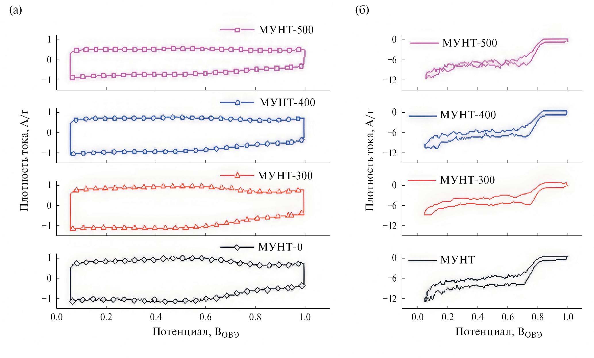 Циклическая вольтамперометрия. Кривые ЦВА образцов, полученные в электролите, насыщенном Ar, имеют форму, характерную для УМ с кислородными группами на поверхности (рис. 6а). При увеличении температуры восстановления наблюдается уменьшение кислородной области (диапазон потенциалов 0.05–0.8 ВОВЭ) на ЦВА. Для всех образцов форма кривой ЦВА в присутствии кислорода становится S-образной, что свидетельствует об активности материалов в РВК (рис. 6б).