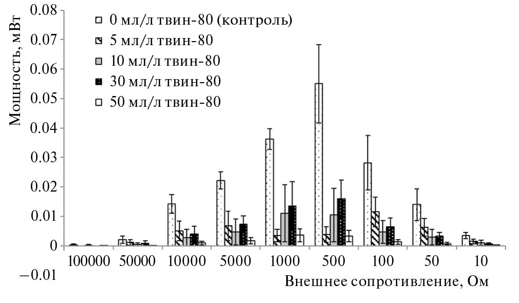 Неионогенный ПАВ твин-80 снижал показатели напряжения (рис. 4a), силы тока (рис. 4б) и мощности (рис. 5), генерируемые в БТЭ штаммом M. luteus, при содержании от 5 мл/л. Однако следует отметить, что концентрационной зависимости электрогенной активности штамма в БТЭ выявить не удалось.