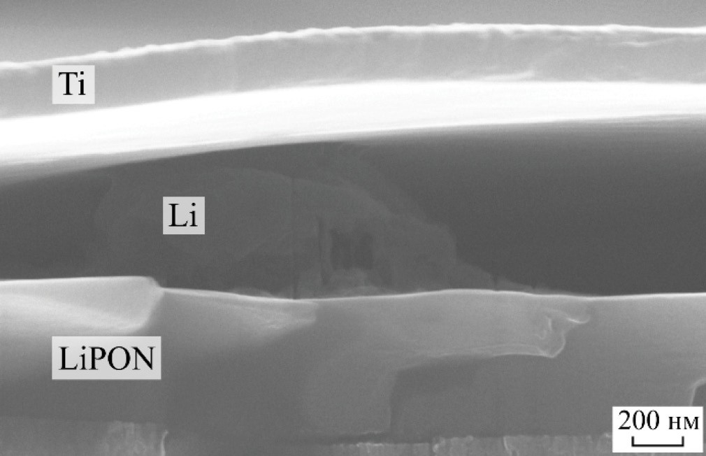 В случае “безанодных” аккумуляторов деградация значительно ускоряется за счет неравномерного in situ осаждения лития на границе с электролитом, что также отмечалось в других работах [10, 36]. Это хорошо видно на СЭМ-изображении поперечного скола “безанодного” образца после циклирования (см. рис. 7). Кроме того, адгезия лития к титановому токоотводу невелика, а необходимый контакт создается в основном за счет ламинирующей пленки. После удаления пленки верхний токоотвод легко отшелушивается. Сравнительно хорошая циклируемость аккумуляторов с анодами Si@O@Al-154 нм или LixSi@O@Al обусловлена сочетанием надежного адгезионного сцепления анода и электролита, а также умеренным изменением объема анодного слоя во время циклирования. Последнее достигается за счет баланса емкостей анода и катода. Во всех случаях кулоновская эффективность составляла более 99%. Из этого следует, что основным механизмом деградации является уменьшение активной площади ТТЛИА в результате медленного механического разрушения контакта с верхним токоотводом.
