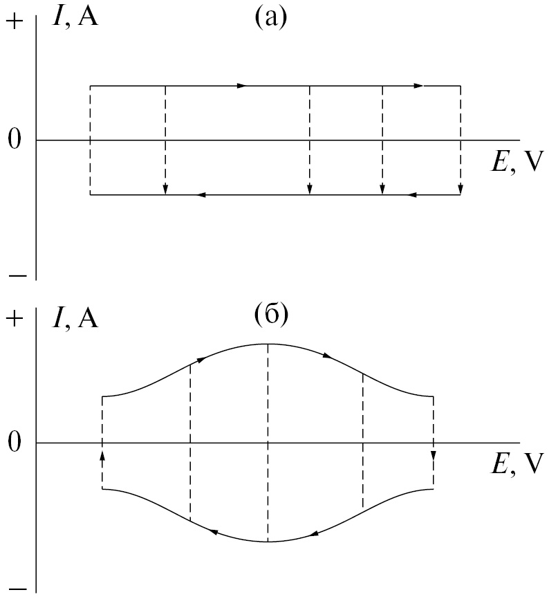 Рис. 1. Схематические ЦВА-зависимости для электрода идеального ДСК, в котором происходит заряжение ДЭС (a) и для электрода ПсК с псевдоемкостью (б) [2].