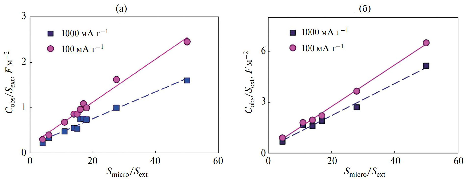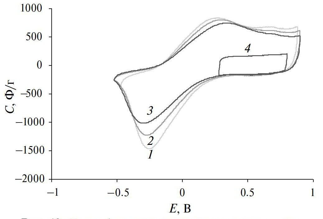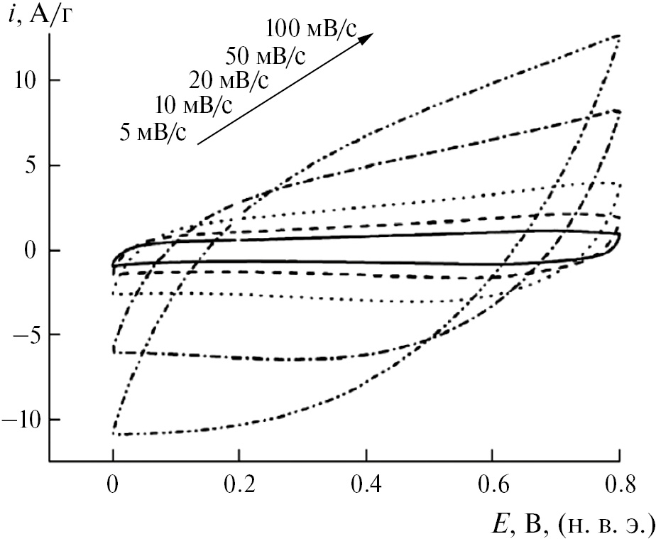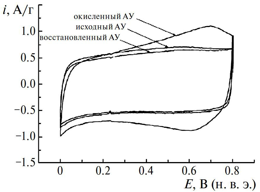 где S – удельная поверхность (см2/г). Для получения высокой емкости в ДСК применяются электроды, обладающие высокой удельной поверхностью S ~ 500–2500 м2/г, в качестве основы которых используются высокодисперсные углеродные материалы: активированные угли [1, 2], аэрогели, сажи, углеродные нанотрубки, нановолокна, карбидные угли, графены и др.