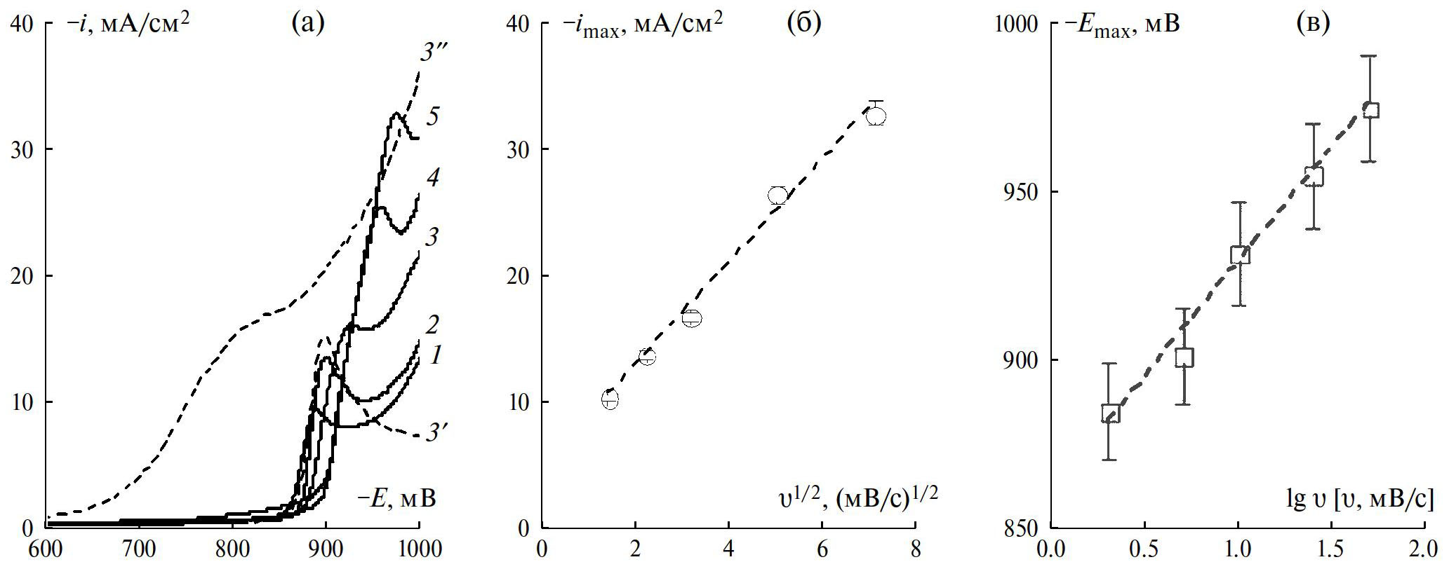 Рис. 1. (а) Катодные вольтамперограммы, полученные на Au-электроде в 0.08 М NiCl2 + 0.04 M ZnCl2 + 2 М NH4Cl (1–5), 0.04 M ZnCl2 + 2 М NH4Cl (3ʹ) и 0.08 М NiCl2 + 2 М NH4Cl (3ʺ) при разных скоростях сканирования потенциала: 2 (1), 5 (2), 10 (3, 3ʹ, 3ʺ), 25 (4), 50 (5) мВ/с. (б) Зависимость плотности тока максимума от квадратного корня из скорости сканирования потенциала. (в) Зависимость потенциала максимума от логарифма скорости сканирования потенциала.