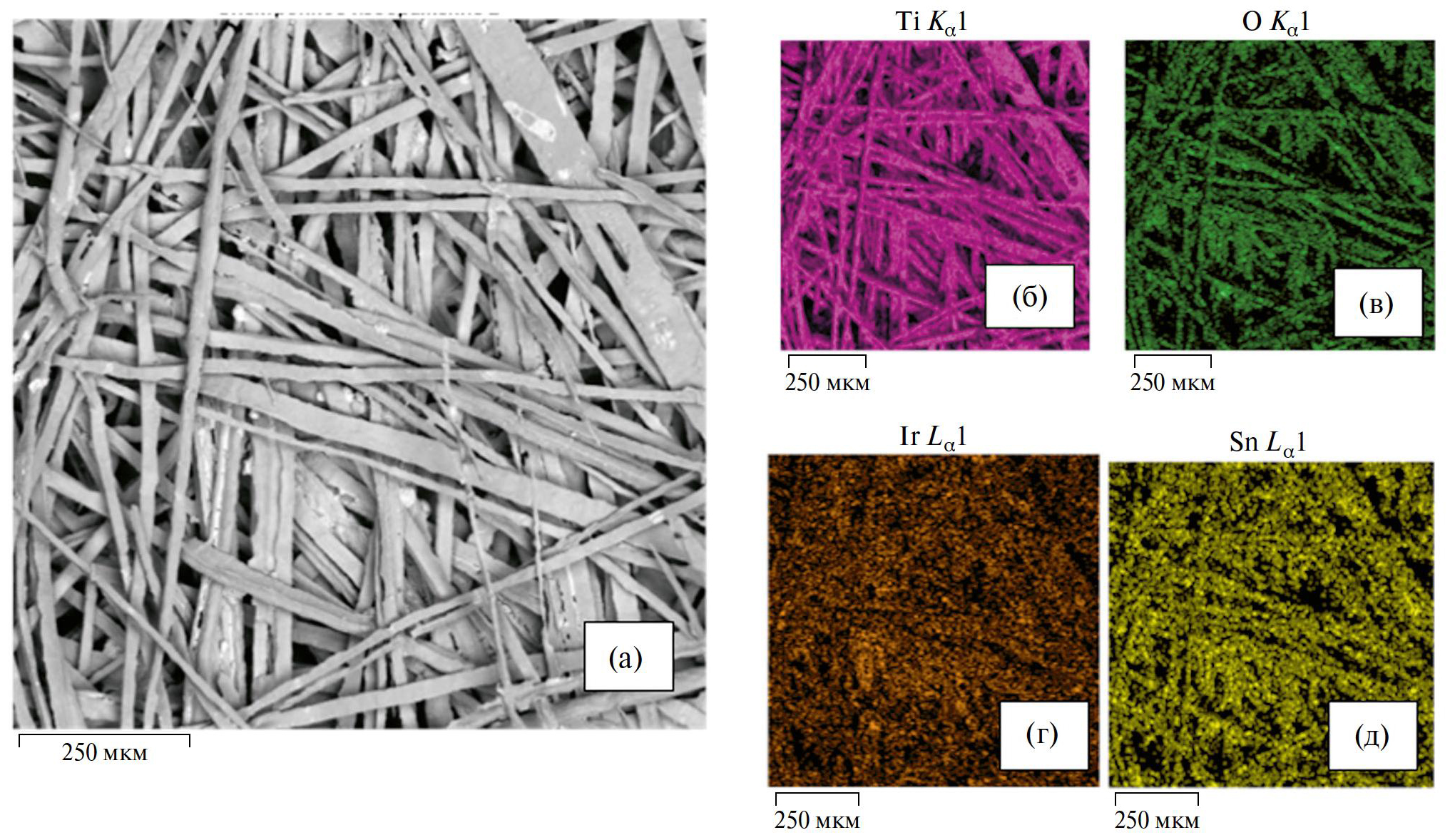 Морфологию полученных IrO2 /TiO2 /Ti-электродов исследовали методом СЭМ на электронном микроскопе Tescan Vega 3 c EDS-приставкой Oxford Instruments X-Act. По результатам РСМА были получены карты распределения элементов (Ir, Sn, Ti, O) по образцам титанового войлока.