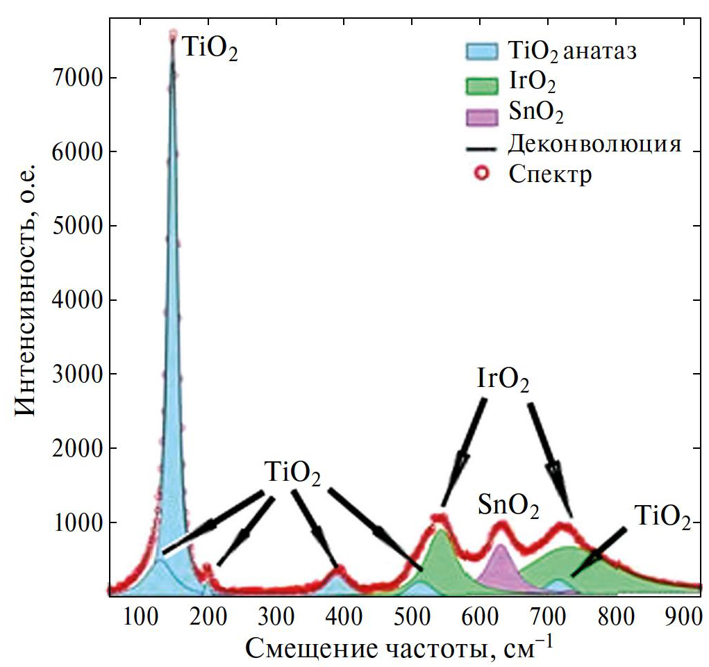 На рис. 3 приведены РФЭС-спектры высокого разрешения для элементов Ir, Sn, O и Ti на поверхности электрода. Чтобы получить полную информацию о составе образца, рассмотрим спектры на рис. 3а, 3б, 3в и 3г. Как показано на рис. 3а, энергиям связывания 62.2 эВ и 65.2 эВ соответствуют сигналы Ir 4 f7/2 и Ir 4 f5/2. Таким образом, спектры РФЭС показывают, что частицы иридия находятся в высоковалентном состоянии IrIV, что соответствует литературным данным [40–45], а также сходится с результатами КР-спектроскопии на рис. 4. На рис. 3б линии оксидов олова SnO2 и SnO располагаются очень близко, поэтому можно выделить только их суммарную линию Sn 3d. Также осложняет деконволюцию спектров олова на рис. 3в присутствие пиков Ir 4p3. Таким образом, содержание олова в покрытии электродного материала определяли по рис. 3в. Высокое количественное соответствие позволяет выделить два пика, относящиеся к олову на спектре кислорода (рис. 3в). На спектрах (рис. 3в) энергия связи 530.6 эВ соответствует IrO2, 530.2 эВ – TiO2, 531.8 эВ – SnO, 530.9 эВ – SnO2. Пик, соответствующий энергии связи 533.3 эВ (H2O), возникает из-за использования водного раствора прекурсора. Оставшиеся пики: 532.3 эВ (С–О, С–ОН); 534.5 эВ (NaKLL) 531.3 эВ (O* = C–O) обусловлены тем, что титановую подложку получают в ходе синтеза с использованием органического прекурсора. На рис. 3г спектр соответствует TiO2. Деконволюция спектров РФЭС дала для состава покрытия титанового войлока: 21%IrO2 / 3.5%SnO + 1.5%SnO2 / 8%TiO2.