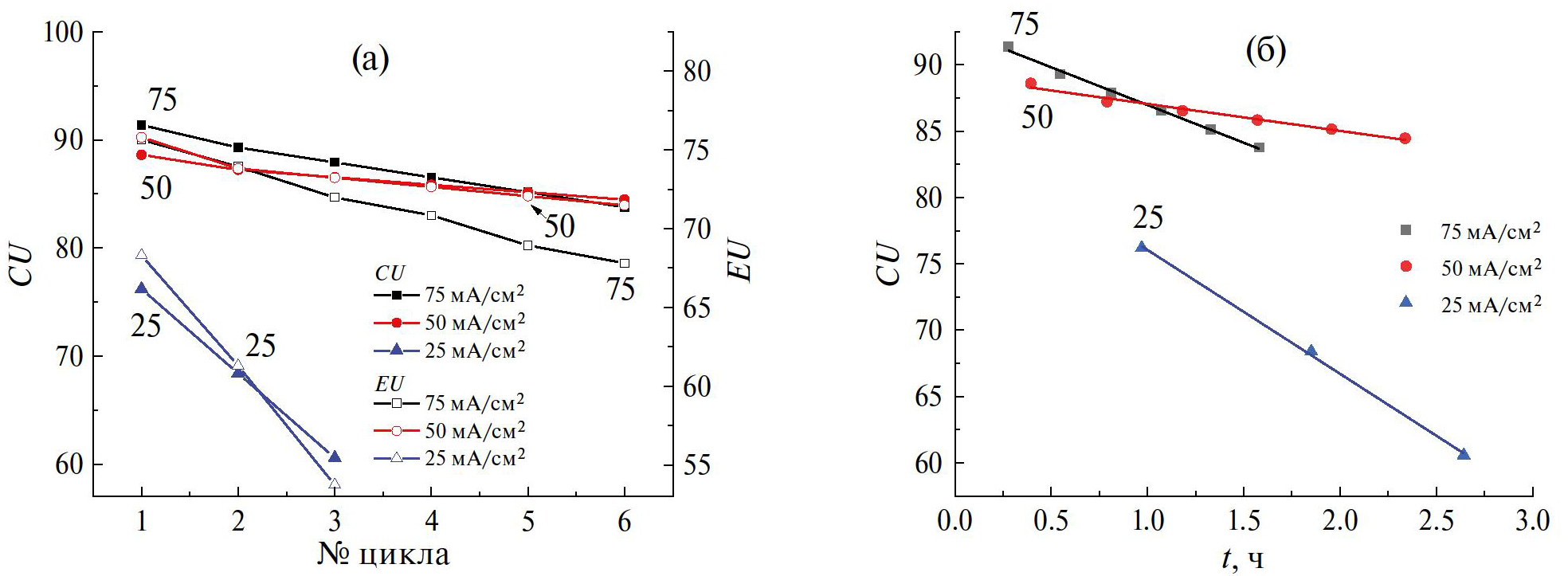 Для оценки работы водородно-бромной проточной редокс-батареи были рассчитаны также коэффициенты использования редокс-емкости электролита (CU) (рис. 7а) и энергии (EU) (рис. 7б) для различных плотностей тока 25, 50 и 75 мА/см2.