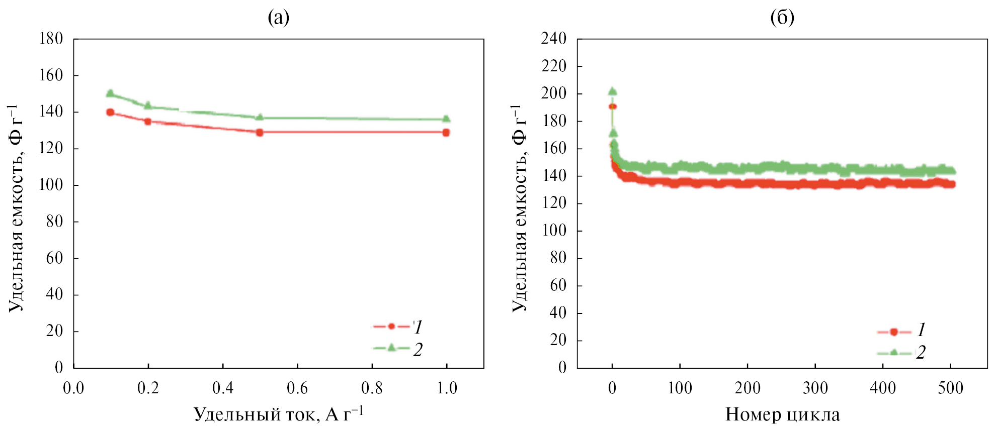 Графеновые электроды отличаются высокой обратимостью зарядно-разрядных процессов. Это наглядно видно из рис. 1, на котором приведены зависимости удельной емкости от удельного тока и от числа гальваностатических циклов заряда/разряда для двух разных электродов с площадью удельной поверхности 450 и 520 м2 г–1, изготовленных на основе ВОГ, который наносился на никелевый войлок. Электрохимические измерения проводились в 30 вес. % КОН [45]. Как видим, при изменении удельного тока на порядок емкость почти не изменилась. Также видно, что в течение 500 циклов емкость практически оставалась постоянной.