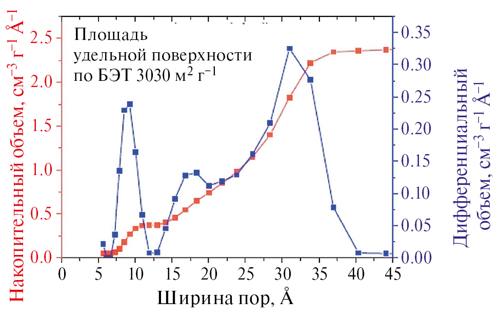 На рис. 2 приведены интегральная и дифференциальная кривые распределения пор по размерам (ширине). Как видим, дифференциальная кривая имеет два явных максимума и один слабо выраженный максимум. УП по БЭТ равна очень большой величине 3030 м2/г.