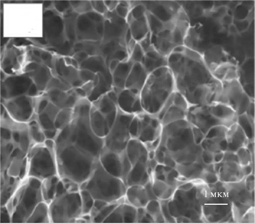 Трехмерный (3D) пористый графен с плоскими нанопорами и иерархической пористой структурой привлек большой интерес в [48] вследствие его применения в суперконденсаторах из-за большой УП, очень высокой проводимости и уникальной пористой структуры. Сочетая в себе преимущества как пористых материалов, так и графена, 3D-пористый графен рассматривается как воплощение идеи для создания иерархического гибрида с комплексными электрохимическими характеристиками с целью получения высокой удельной энергии. В данном обзоре были обобщены достижения последних лет в области изготовления 3D-пористых структур на основе графена с микро-, мезо- и макропорами, а также исследованы взаимосвязи между структурой и электрохимическими свойствами, а также обсуждено их применение в суперконденсаторах. На рис. 3 приведено СЭМ-изображение 3D-графена с макропорами, образованными путем удаления порообразователя Na2CO3.