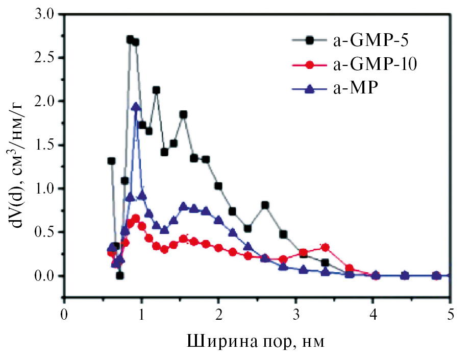 Активированный восстановленный оксид графена (a-rGO) представляет собой материал с жесткой 3D-пористой структурой, высокой УП и иерархическим типом пористой структуры. Используя варьирование параметров активации и механическую обработку после синтеза, в [59] получили два набора материалов с широким диапазоном УП по БЭТ ~1000–3000 м2/г, а также существенные различия в распределении пор по размерам и содержании поверхностного кислорода. Эффективность активированного графена в качестве электрода в суперконденсаторе с электролитом КОН коррелировала со структурными параметрами материалов и водосорбционными свойствами. Было установлено, что a-rGO является гидрофобным материалом, о чем свидетельствует пренебрежимо малая величина УП БЭТ по H2О, определяемая с помощью анализа изотерм сорбции водяного пара. Однако общий объем пор, определенный с помощью сорбции водяного пара и сорбции жидкой воды, практически не отличался от объема, полученного при анализе изотерм сорбции азота. Наилучшие гравиметрические и объемные емкости в электролите КОН были достигнуты не для образцов с наибольшим значением УП БЭТ (N2) для материалов с 80–90% от общего объема пор в микропорах и повышенно УП по БЭТ (H2О). Сравнение характеристик электродов, изготовленных с использованием rGO и a-rGO, показывает, что более гидрофильная поверхность благоприятна для хранения заряда в суперконденсаторах с электролитом КОН.