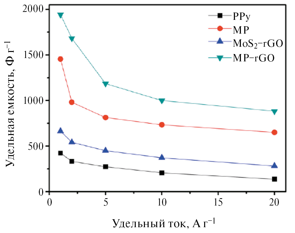 В работе [51] было обнаружено, что суперконденсатор с электродами на основе графена имеет удельную плотность энергии 85.6 Вт ч/кг при комнатной температуре и 136 Вт ч/кг при 80°C при 1 А/г. Эти значения плотности энергии сопоставимы с таковой у никель-металлогидридного аккумулятора, но суперконденсатор можно заряжать или разряжать за секунды или минуты. Ключом к успеху стала возможность в полной мере использовать высокую УП однослойного графена путем подготовки изогнутых графеновых листов, что позволяет образовывать мезопоры, доступные и смачиваемые экологически безопасными ионными жидкостями, способными работать при напряжении >4 В.