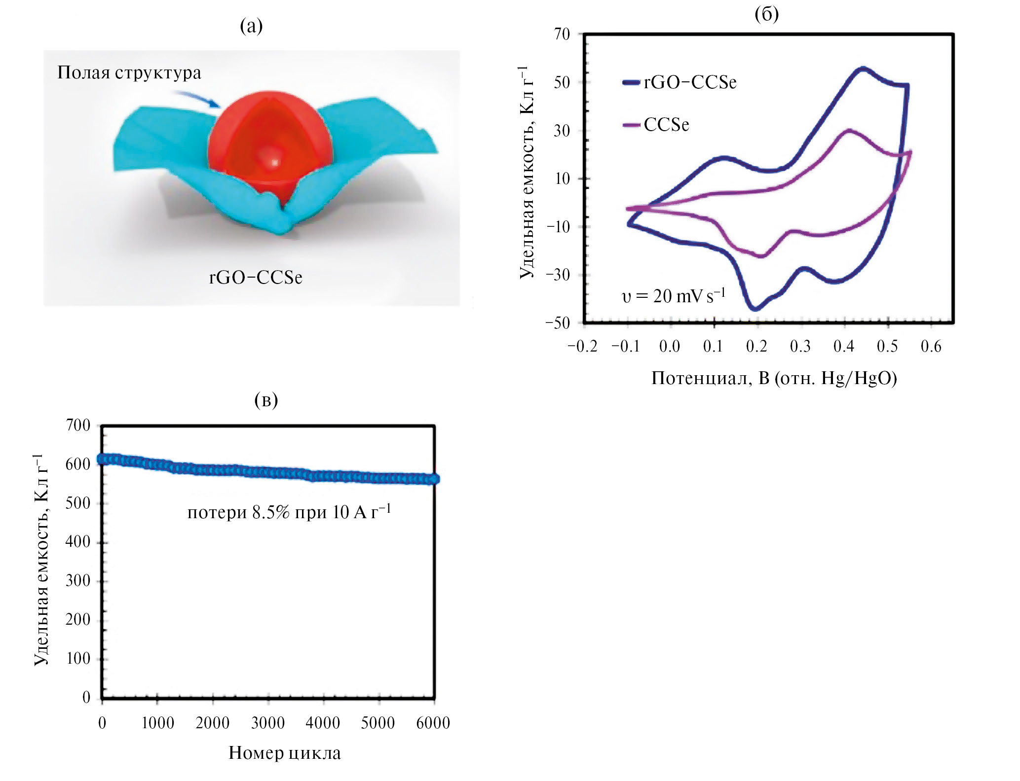 Получение углеродного электрода с высокой гравиметрической и объемной емкостью при больших нагрузках имеет решающее значение для суперконденсаторов. При этом дефектные графеновые наносферы (ГНС) хорошо удовлетворяют вышеуказанным требованиям [56–62]. Морфология и структура ГНС контролируются временем микроволнового нагрева и содержанием железа. Типовая ГНС с УП 2794 м2/г, объемом пор 1.48 см3/г и плотностью упаковки 0.74 г/см3 задают высокие гравиметрические и объемные емкости 529 Ф/г и 392 Ф/см3 при 1 А/г с удержанием 62.5% емкости при 100 А/г в трехэлектродной системе в 6 моль/л КОН. В двухэлектродной системе ГНС обладает плотностью энергии 18.6 Вт ч/кг (13.8 Вт ч/л) при высокой удельной мощности 504 Вт/кг.