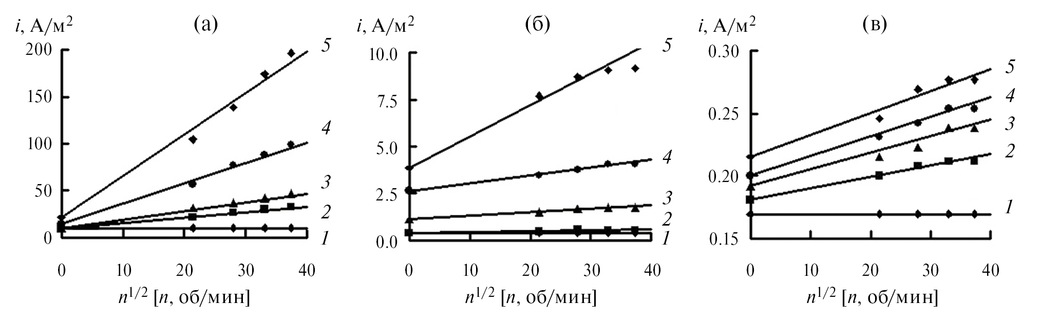 Рис. 2. Зависимость плотности катодного тока от частоты вращения стального диска в 2 M H3PO4 (а) с добавками 0.5 мМ ИФХАН-92 + 0.5 мМ KNCS (б) и 5 мМ ИФХАН-92 + 0.5 мМ KNCS (в), содержащей FePO4, М: 1 – 0; 2 – 0.01; 3 – 0.02; 4 – 0.05; 5 – 0.10. Е = –0.30 В, t = 25°C.