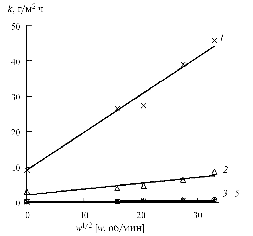 Рис. 4. Зависимость скорости коррозии стали Ст3 от частоты вращения пропеллерной мешалки в коррозионной среде при 20 ± 2°C в 2 M H3PO4 + 0.1 M FePO4 (1) с добавками 0.01 мМ ИФХАН-92 + 0.5 мМ KNCS (2), 0.1 мМ ИФХАН-92 + 0.5 мМ KNCS (3), 0.5 мМ ИФХАН-92 + 0.5 мМ KNCS (4), 5 мМ ИФХАН-92 + 0.5 мМ KNCS (5). Продолжительность опытов – 2 ч.