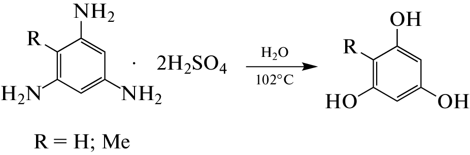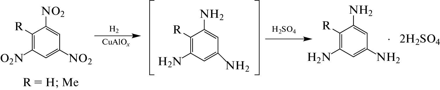The catalytic properties of a copper-aluminum oxide catalyst obtained from double layered hydroxide have been studied in hydrogenation of 1,3,5-trinitrobenzene (TNB) and 2,4,6-trinitrotoluene (TNT) in a flow reactor. The reaction was carried out at temperature of 120°C, total pressure of 30 bar and substrate concentration of 0.10–0.15 M, using methanol as a solvent. 1,3,5-Triaminobenzene (TAB) and 2,4,6-triaminotoluene (TAT) were isolated from the reaction mixture in the form of double salts with sulfuric acid TAB⋅2H2SO4 and TAT⋅2H2SO4, the yield of which was 92 and 98%, respectively. At an initial trinitroarene concentration of 0.10 M, the hydrolysis of triaminobenzene salts made it possible to synthesize phloroglucinol and methylphloroglucinol in 78 and 91% yields. Increasing the concentration to 0.15 M reduces the yield to 71 and 88%, respectively. According to thermal analysis data, the observed differences in the yields of triaminobenzene salts and polyphenols are explained by the formation of different amounts of resinous by-products on the catalyst surface during hydrogenation of trinitroarene. Hydrogenation of TNT produces less resin, resulting in higher yields of TAT⋅2H2SO4 and methyl phloroglucinol. This is probably due to the presence of an electron-donating methyl substituent, which slows down polycondensation of TAT molecules.