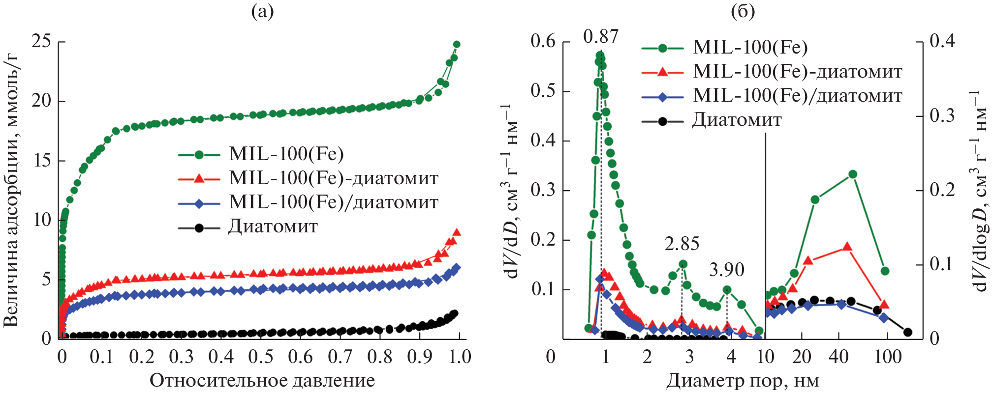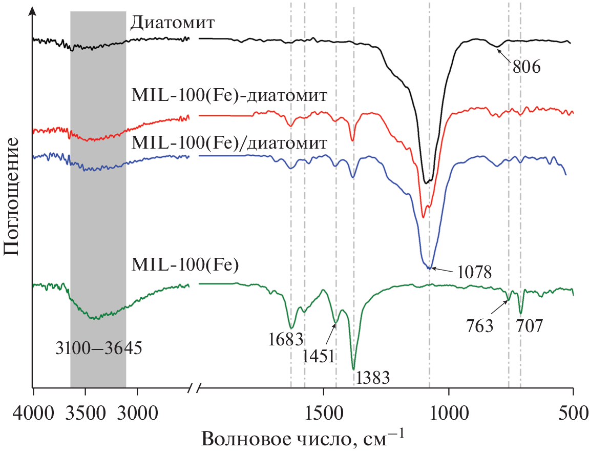 Получены пористые композиты на основе металлорганического каркаса MIL-100(Fe) и природного материала диатомита. Композиты характеризуются удельной поверхностью 322 и 441 м2/г и иерархической пористой структурой, представленной широкими порами исходного диатомита и узкими мезо- и микропорами сформированных частиц MIL-100(Fe). Изучено влияние подхода к синтезу на структуру композитов и каталитические свойства в реакции фотокаталитического разложения фенола. В композите, приготовленном с предварительной пропиткой диатомита раствором нитрата железа, частицы MIL-100(Fe) формируются в основном внутри пор диатомита. Образцы композитов проявляют каталитическую активность в разложении фенола в реакции фото-Фентона. Наибольшей активностью обладает образец, синтезированный без предварительной пропитки диатомита, для которого характерно формирование частиц MIL-100(Fe) преимущественно на внешней поверхности диатомита.