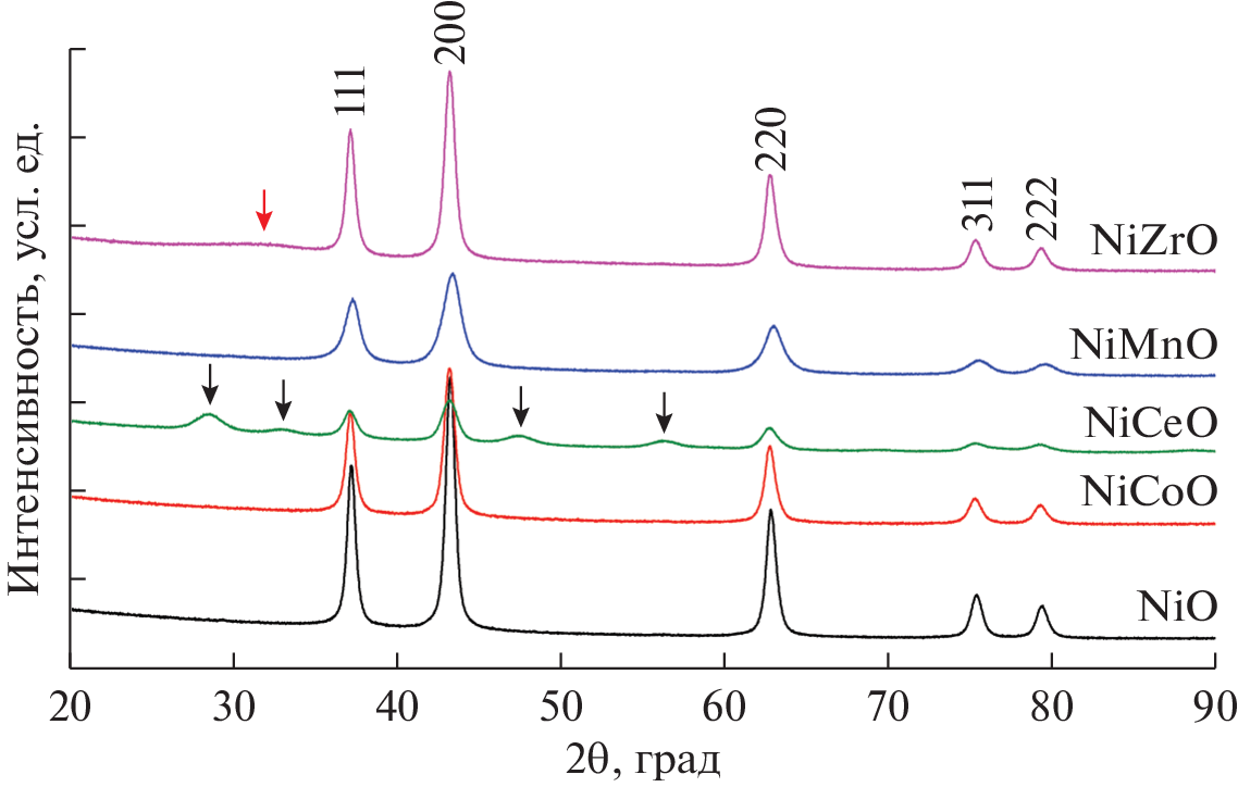 In this work the activation process and the effect of modifying additives on the phase composition and structure of a series of catalysts with the general composition Ni0.9M0.1O (M = Co, Ce, Mn, Zr) synthesized by co-precipitation were studied. The influence of the additives on the initial state of the samples was investigated by XRD, and their influence on the NiO reduction process was studied by in situ XRD and TPR-H2. It was shown that the introduced modifiers influence on the structure and microstructure of the initial samples, increasing the value of the specific surface and decreasing the average size of NiO CSR. Introduction of Mn, Co leads to formation with NiO oxide of solid solutions of replacement. For Ce and Zr the release of CeO2 oxide and X-Ray-amorphous ZrOx is observed. The use of these additives leads to an increase in the temperature of NiO reduction to the metallic state compared to the massive oxide. In addition, the effect of modifying additives on the particle size of the final metal is observed. The introduction of Ce and Mn decreases the average size of the NiO CSR in 2–5 times compared to the massive NiO.