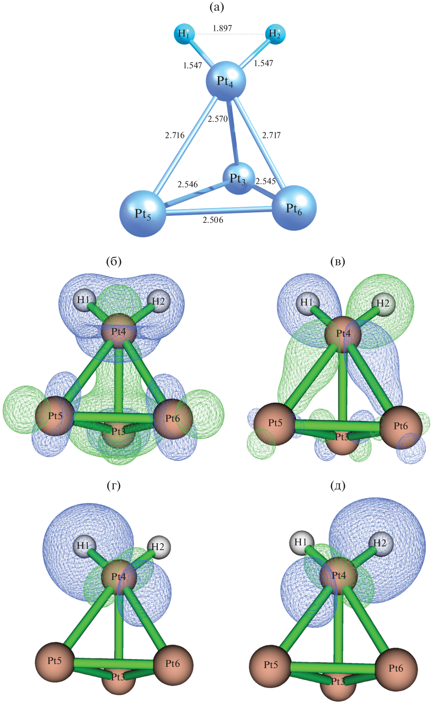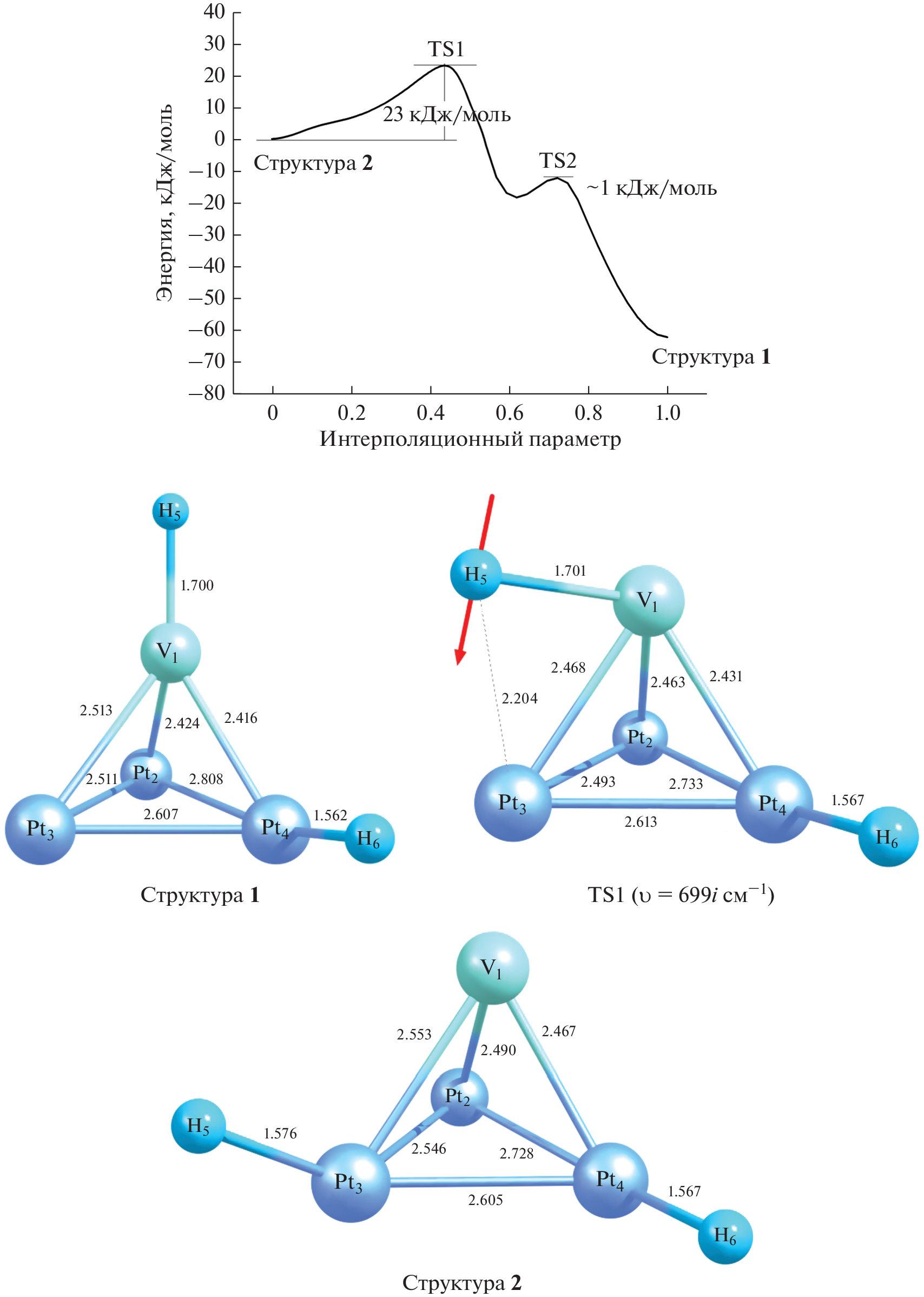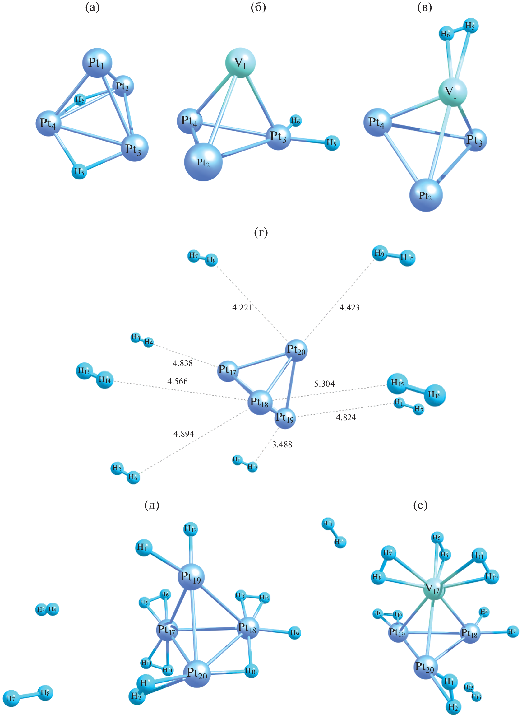 The NEB DFT/PBE0/def2tzvp quantum-chemical method with the construction of minimum energy paths (MEP) was used to study the activation of H2 molecules by Pt4 and Pt3V clusters. It is shown that, in the case of Pt4 and Pt3V clusters, barrier-free dissociative adsorption of H2 molecules occurs on platinum centers, while molecular adsorption of hydrogen occurs on the vanadium atom in Pt3V with a slight weakening of the H–H bond, but without its breaking. The noted features of the coordination of H2 molecules are explained at the level of the MO method. It has been established that the migration of the H atom from one cluster metal center to another in the considered model clusters, as, possibly, in the phenomenon of hydrogen spillover, occurs at small activation barriers in the direction of the displacement vector corresponding to the normal vibration of the system in the transition state. In the process of hydrogen migration, a significant role of Pt–H–Pt and V–H–Pt bridging groups, which facilitate the transition of H atoms from one metal center of the cluster to another, has been revealed.