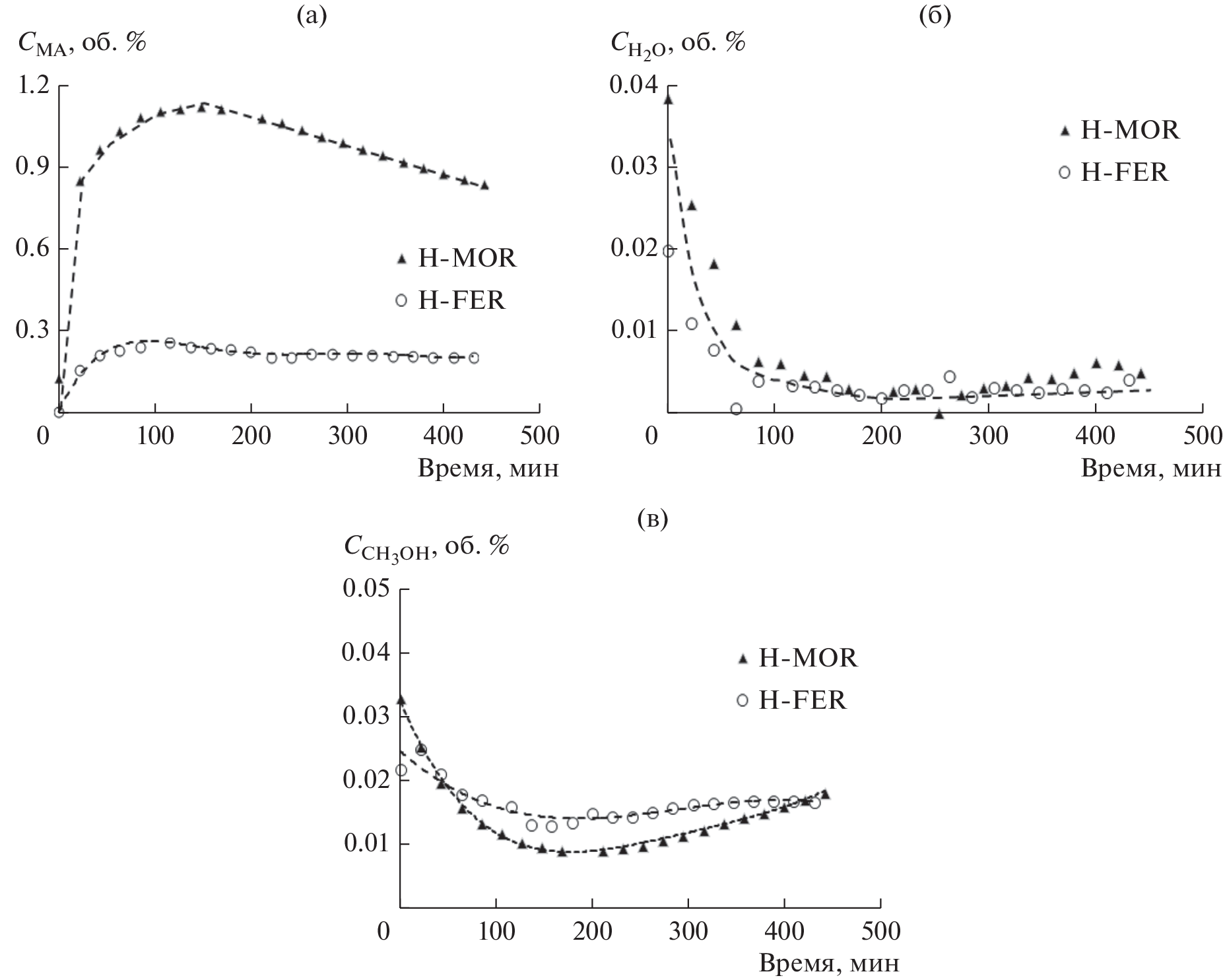 Mordenite and ferrierite (Zeolyst International, H-form, SiO2/Al2O3 ≈ 20) were used to study the adsorption, thermally programmed desorption, and carbonylation of dimethyl ether (DME). The behavior of mordenite with Cu, Co, and Mg cations introduced by ion exchange has also been studied. DME carbonylation was carried out at 200°C, pressure 3 MPa, space velocity 8000 ml g–1 h–1 in a mixture, vol. %: ⁓2.2 DME, 92.8–95.5 CO, rest. N2. After the induction period, the methyl acetate content is about 4–5 times higher for mordenite compared to ferrierite. The formation of water, methanol and hydrocarbons was observed in small quantities. The introduction of Cu, Co, Mg cations into mordenite by ion exchange (single ion exchange, cation/Al ratio no more than 35%) not only increased the stability, but also increased the activity in the DME carbonylation reaction. It was found that an increase in the content of copper (from 1.19 to 2.23 wt %) and Mg (from 0.62 to 1.8 wt %) differently affects the activity. In the case of copper, an increase in activity was observed, while in the case of magnesium, the activity decreased. Preliminary reduction of copper-exchange mordenite leads to a decrease in activity and the appearance of metallic copper particles on the surface of mordenite crystallites. According to in situ diffuse reflectance infrared spectroscopy, the introduction of magnesium cations by triple ion exchange leads to a noticeable decrease in the number of Brønsted acid sites (BACs) in both the 12-MR and 8-MR channels of mordenite. The catalytic characteristics of ferrierite practically do not change when copper and magnesium are introduced by ion exchange.