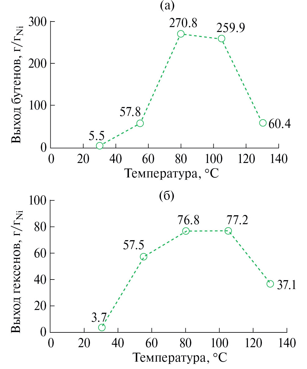 При Т = 55°C наблюдается образование олигомеров с относительно высокой молекулярной массой – содержание фракции С22+ в этих условиях составляет 51.4 мас. %. Повышение температуры от 55°C до 80–105°C сопровождается снижением показателя Шульца–Флори α от 0.66 до 0.19–0.20 и, соответственно, увеличением селективности по бутенам (с 16.9% до 71.4–72.6%) и гексенам (с 16.8% до 20.6–21.2%). Резкое возрастание выхода бутенов и скорости образования бутена-1 с ростом температуры олигомеризации от 55°C до 80–105°C хорошо видно на рис. 4.