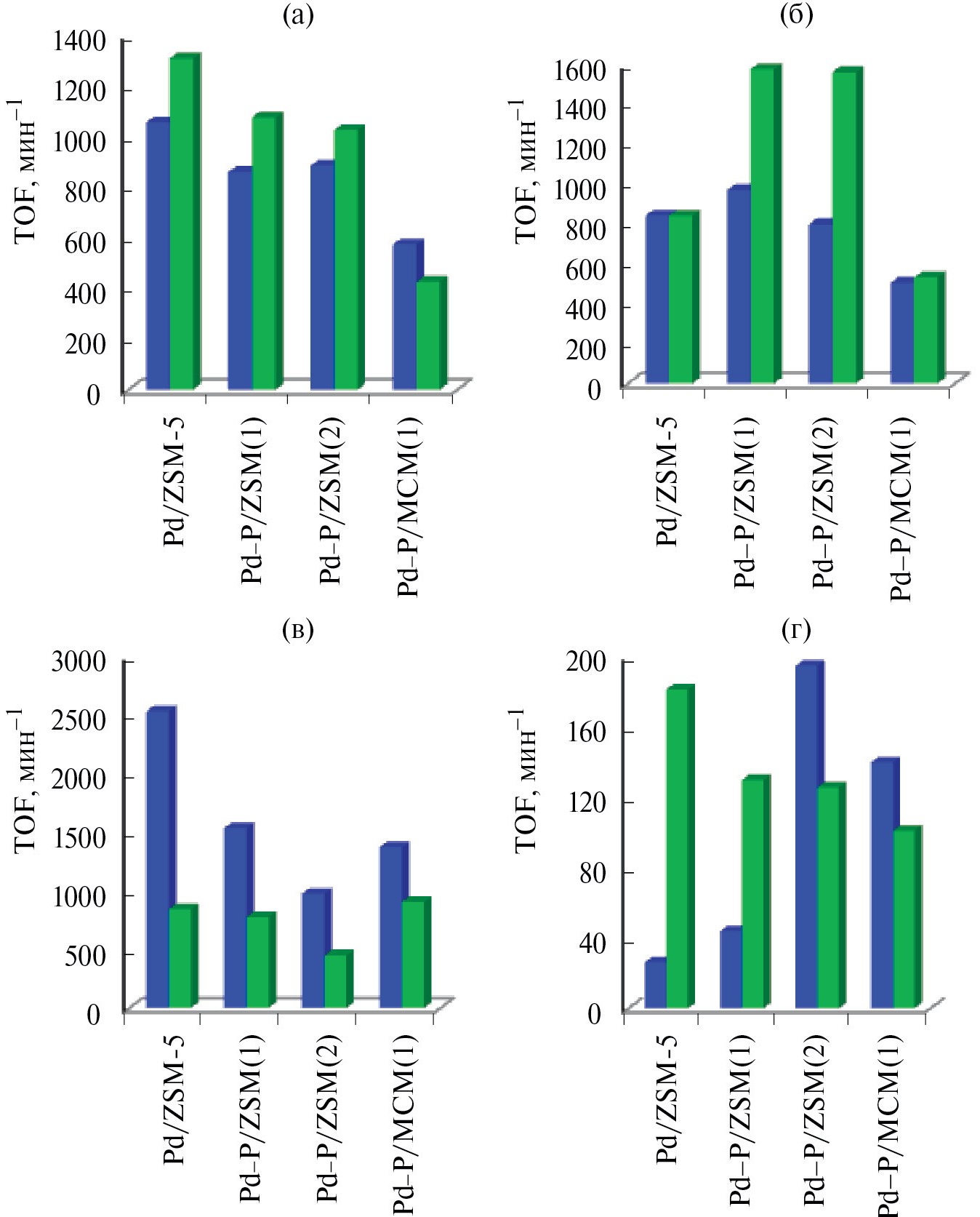 Рис. 6. Сравнение частоты оборотов гидрирования ацетиленовых производных (синие столбцы): фенилацетилена (а), гексина-1 (б), 2-метилбутин-2-ола (в) и бутин-2-диола-1,4 (г) и образующихся из них олефинов (зеленые столбцы) под действием Pd-содержащих катализаторов.