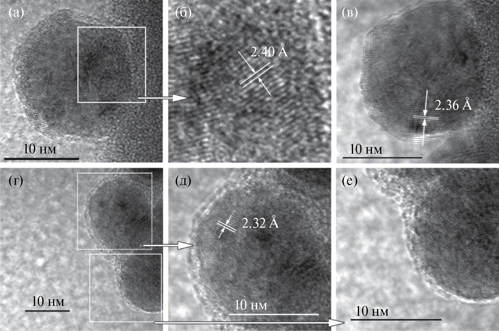 Рис. 7. ПЭМ-снимки высокого разрешения катализатора Pd–P/МСМ-41(1) (а, б, в) и Pd–P/ZSM-5(2) (г, д, е).