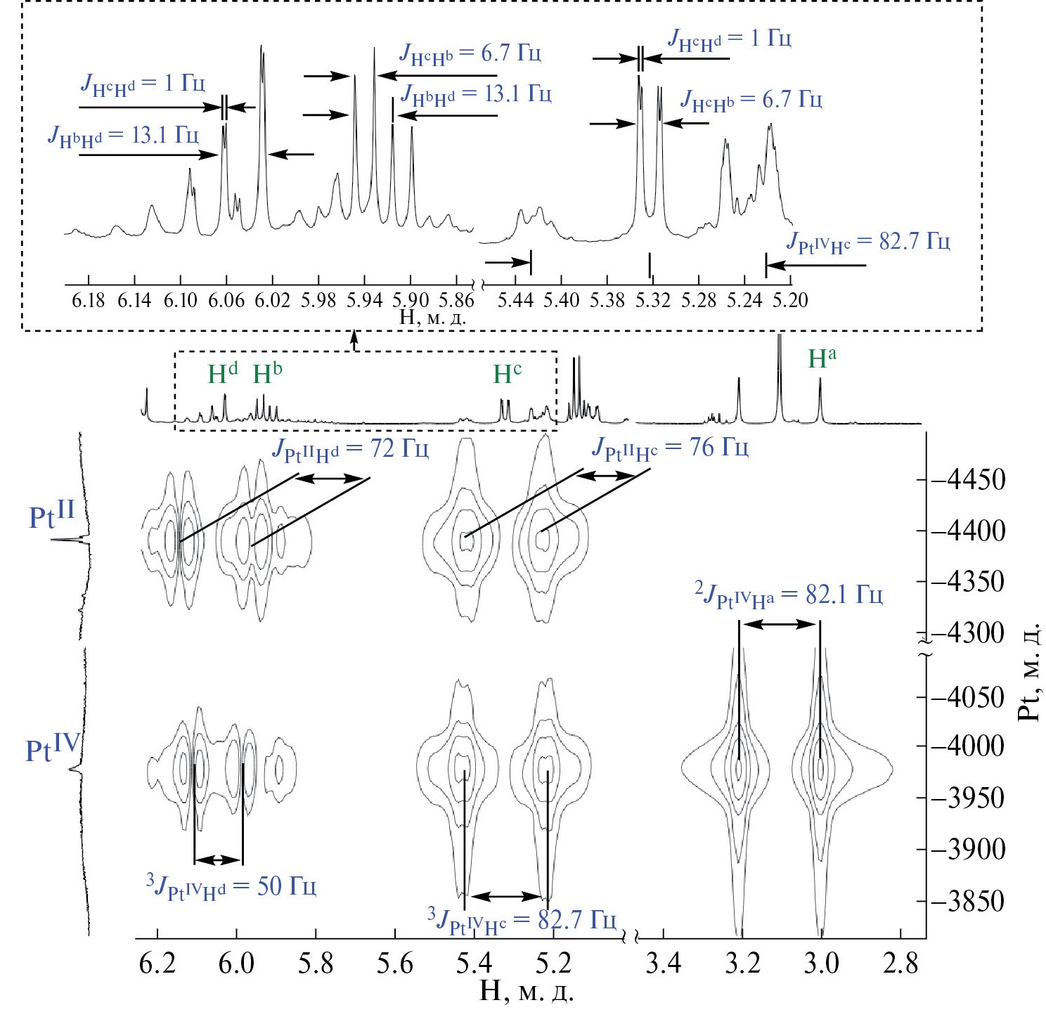 В ¹⁹⁵Pt ЯМР-спектре зафиксированы сигналы с химическими сдвигами 3977 и 4391 м. д: положение слабопольного близко к бис-органильным комплексам Ptᴵᵛ (около –4000 м. д. [24]), а сильнопольного – к исходным иодидным комплексам Ptᴵᴵ (–5035 м. д. [25]) (рис. 4). Платиновые сателлиты сигналов всех протонов в двухмерном HMQC(¹H–¹⁹⁵Pt)-спектре имеют кросс-пики со слабопольным ¹⁹⁵Pt ЯМР-сигналом, а винильных – еще и с сильнопольным. Это свидетельствует о нахождении обоих атомов платины в одном комплексе. Гетероядерная КССВ ³JPtН(цис) = 50 Гц, близкая к величинам констант в органильных производных платины(IV) [18], существенно меньше вицинальной константы ³JPtН(транс) = 82.7 Гц, что согласуется с разным расположением протонов у β-атома углерода: Hᶜ находится в транс-положении к Ptᴵᵛ, а Hᵈ – в цис-положении. Несколько меньшие, чем ³JPtН(транс), но близкие между собой по величине КССВ JPtН = 72 и 76 Гц указывают на π-координацию двойной связи винильного лиганда к комплексу Ptᴵᴵ [18]. Наложение сигналов Hᵈ и Hᵇ в двухмерном HMQC(¹H–¹⁹⁵Pt)-спектре не позволило достоверно определить величины гетерояденых КССВ для протона Hᵇ.