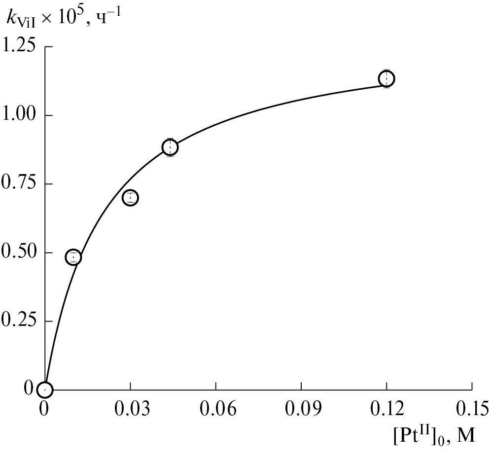 Наблюдаемая константа скорости реакции псевдопервого порядка монотонно растет по мере увеличения концентрации загруженного катализатора (рис. 3). Экспериментальная зависимость kViI([Ptᴵᴵ]₀) хорошо описывается эмпирическим уравнением