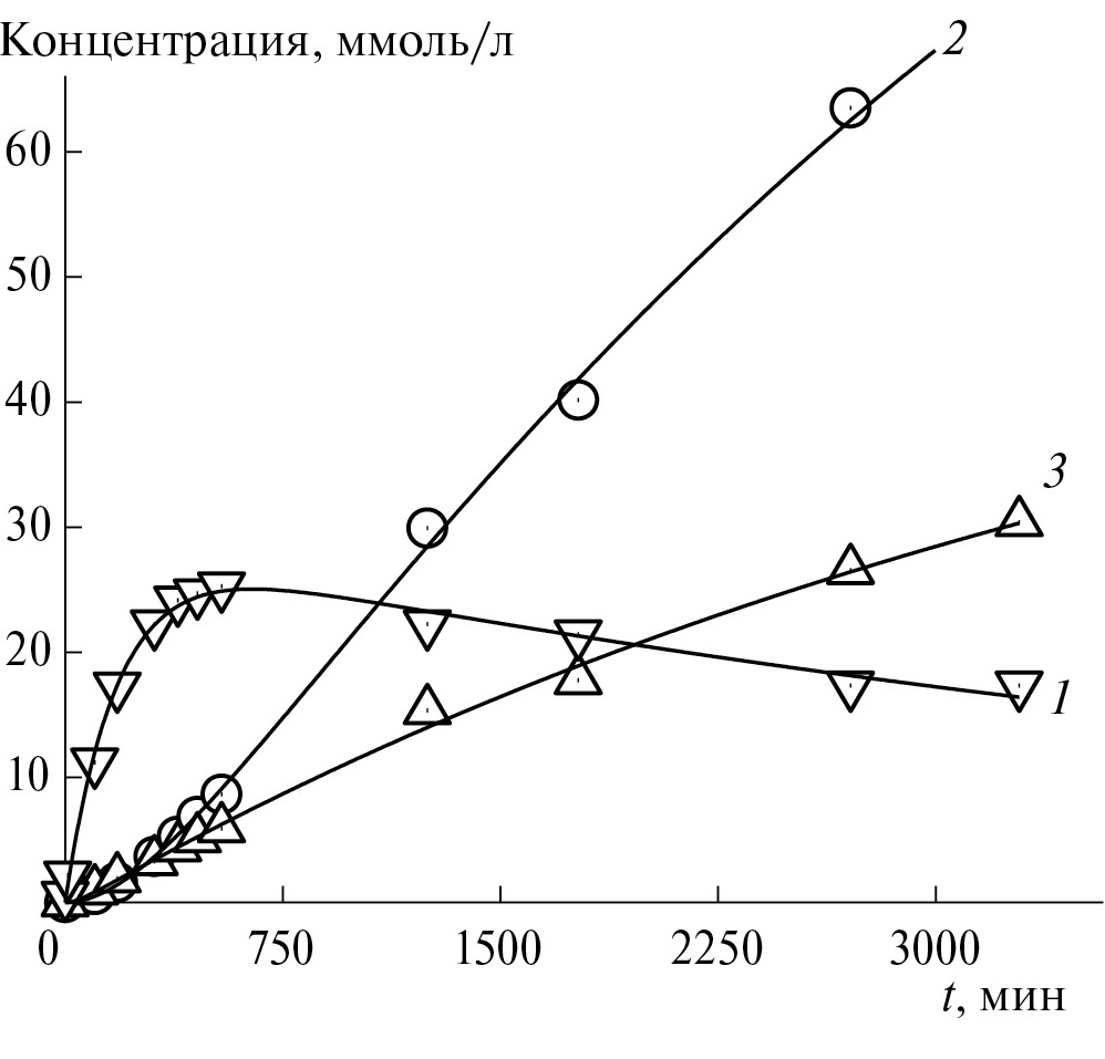 Рис. 5. Фрагмент кинетики изменения концентрации интермедиата (1) и накопления продуктов реакции – бутадиена (2) и пропилена (3). Реакционные условия: Т = 23°C, начальные концентрации: [MeI]₀ = 1.3 M; [Ptᴵᴵ]₀ = 0.1 М, [ViI]₀= 0.62 M.