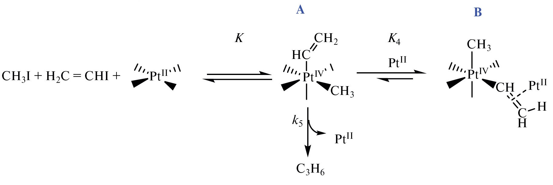 Метильный комплекс платины(II) окислительно присоединяет молекулу второго электрофила – винилиодида, формируя бис-органильное метилвинильное производное Ptᴵᵛ (стадия 3). Равновесная π-координация двойной связи винильного лиганда иодидным комплексом платины(II) (стадия 4) дает наблюдаемый в ЯМР интермедиат Ptᴵᴵ(η²-(H₂C=C(H)–Ptᴵᵛ–CH₃)). Равновесие здесь смещено в сторону биядерного метилвинильного комплекса: моноядерное метилвинильное производное Ptᴵᵛ ЯМР-спектрометрически не зафиксировано.