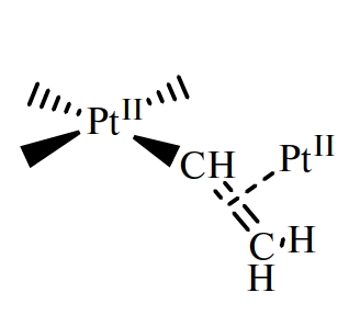 Интермедиат реакции – комплекс Ptᴵᴵ(η²-(H₂C=CH–Ptᴵᵛ–CH₃)). ¹H (δ, м. д.; J, Гц) ацетон-d₆: 6.05 (дд,  ³JHH =13.1; ²JHᵈHᶜ = 1; ³JPtᴵᵛH = 50, JPtᴵᴵH = 72, 1H, Hᵈ), 5.92 (дд, ³JHH = 13.1, ³JHᵇHᶜ = 6.7; 1H, Hᵇ), 5.32 (дд, ³JHHᵇ =6.7, ²JHH = 1; ³JPtᴵᵛH = 82.7, JPtᴵᴵH =76, 1H, Hᶜ), 3.11 (с; JPtᴵᵛH = 82.1, 3H, Hᵃ). ¹⁹⁵Pt{H} (δ, м. д.) ацетон-d₆: –3977 (Ptᴵᵛ), –4391 (Ptᴵᴵ).