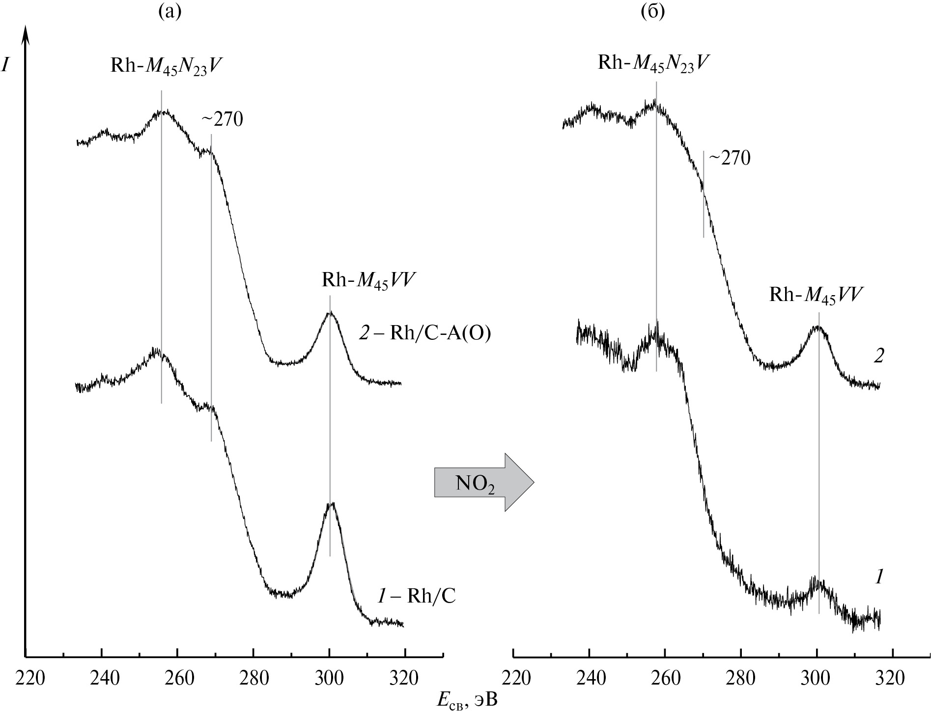 На рис. 3а приведены спектры образцов Rh/C и Rh/C-A(O) в исходном состоянии в регионе, в котором регистрируются Оже-линии родия и углерода. Спектры тех же образцов после взаимодействия с NO₂ в условиях, указанных в табл. 1, представлены на рис. 3б. В спектрах исходных образцов отчетливо видны интенсивные линии Rh-M₄₅VV и Rh-M₄₅N₂₃V. Кинетическая энергия Оже-электронов для отдельно расположенной линии Rh-M₄₅VV составляет 300.6–300.7 эВ, что соответствует металлическому родию [9]. В Оже-спектре углерода особое внимание следует уделить линии с кинетической энергией ~270 эВ, которая отвечает упорядоченной протяженной структуре поверхностного слоя графита, образованной совокупностью параллельно ориентированных слоев графена [32]. Регистрация данного Оже-пика в спектрах исходных образцов Rh/C и Rh/C-A(O) указывает на то, что в наших условиях ни бомбардировка ионами Ar+ (0.5 кэВ, 10⁻⁶ мбар, 30 с), ни обработка при комнатной температуре на воздухе, ни напыление родия не вызывают серьезных изменений в структуре ВОПГ.