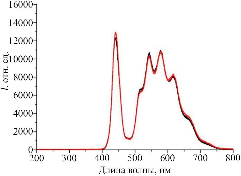 Источник видимого излучения. Источником видимого излучения служила светодиодная лампа DIORA 30 (ЗАО “Физтех-Энерго”, Томск, Россия) с диапазоном 410–750 нм (рис. 1). Видно, что белый свет лампы сформирован четырьмя основными пиками: самый интенсивный (450 нм) – в синей области спектра, три менее интенсивных (500–650 нм) – в зеленой, желтой и красной областях.