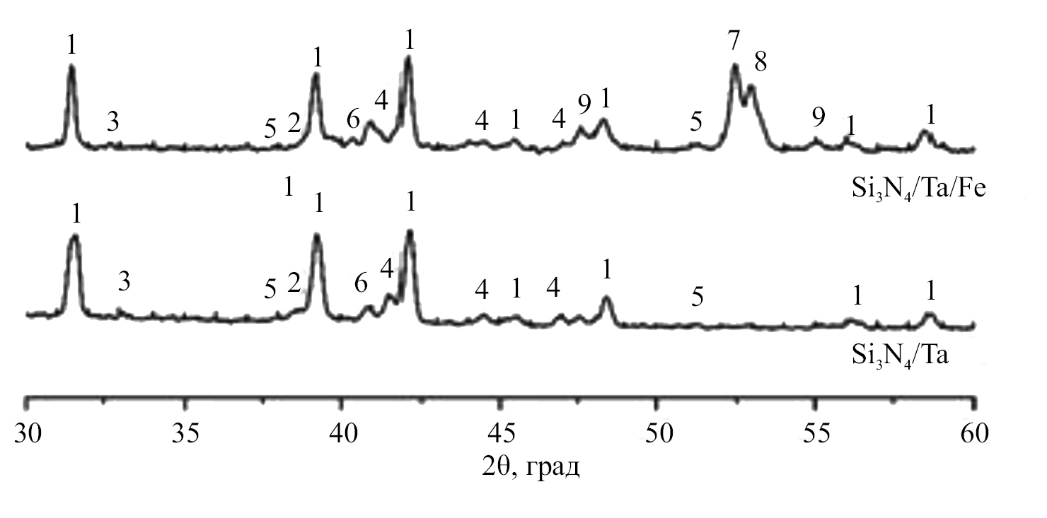 Рис. 2. Фрагменты дифрактограмм азотированных образцов смеси порошков (Si + Al + Та, 10 мас. %) (Si3N4/Ta) и (ФСА + Та, 10 мас. %) (Si3N4/Ta/Fe): 1 – β-Si3N4, 2 – AlN, 3 – Si, 4 – TaN, 5 – TaON, 6 – TaO, 7 – α-Fe, 8 – FexSiy, 9 – Ta2O5.