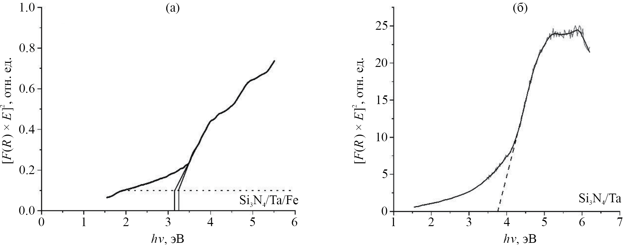 Исследование оптических свойств композитов проводили с использованием спектров отражения, преобразованных с помощью функции Кубелки–Мунка в спектры поглощения (рис. 4). В состав керамической матрицы входят широкозонный полупроводник β-Si3N4 (Eg 4.0–4.5 эВ) [25], поглощающий в области 230–350 нм, и среднезонный полупроводник TaON. Определение Eg полупроводника TaON (Eg ≈ 2 эВ) [14] оказалось затруднительным из-за влияния других полупроводниковых соединений. Ширина запрещенной зоны (3.15 эВ) полупроводника β-Si3N4 композита Si3N4/Ta/Fe согласуется с Eg для β-Si3N4 (3.3 эВ) композита на основе β-Si3N4, полученного ранее азотированием ФСА и включающего небольшие количества сиалона и силицидов железа [17]. Ширина запрещенной зоны полупроводника β-Si3N4 в композите Si3N4/Ta составляет 3.76 эВ.