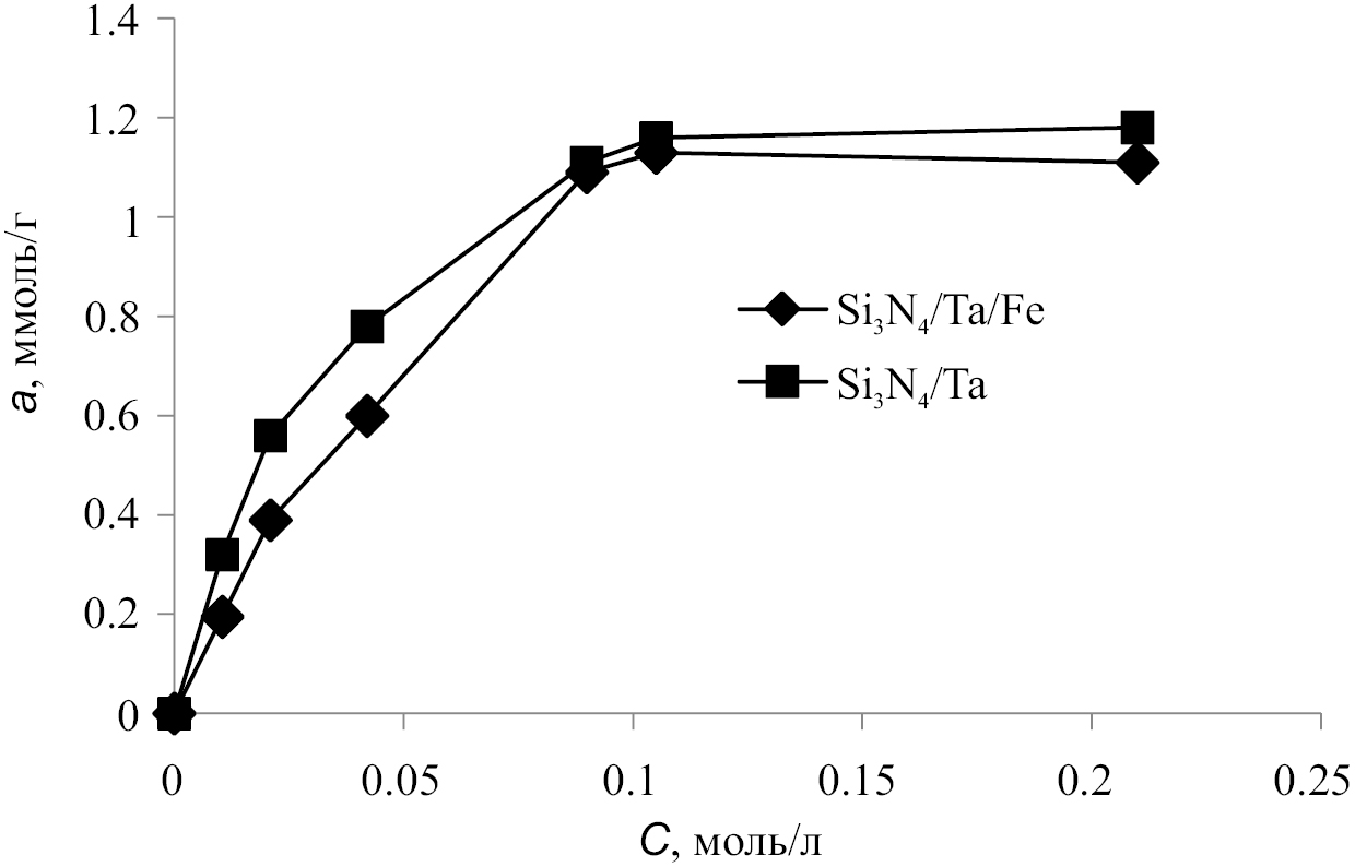 Для описания экспериментальных данных применяли уравнение Ленгмюра: