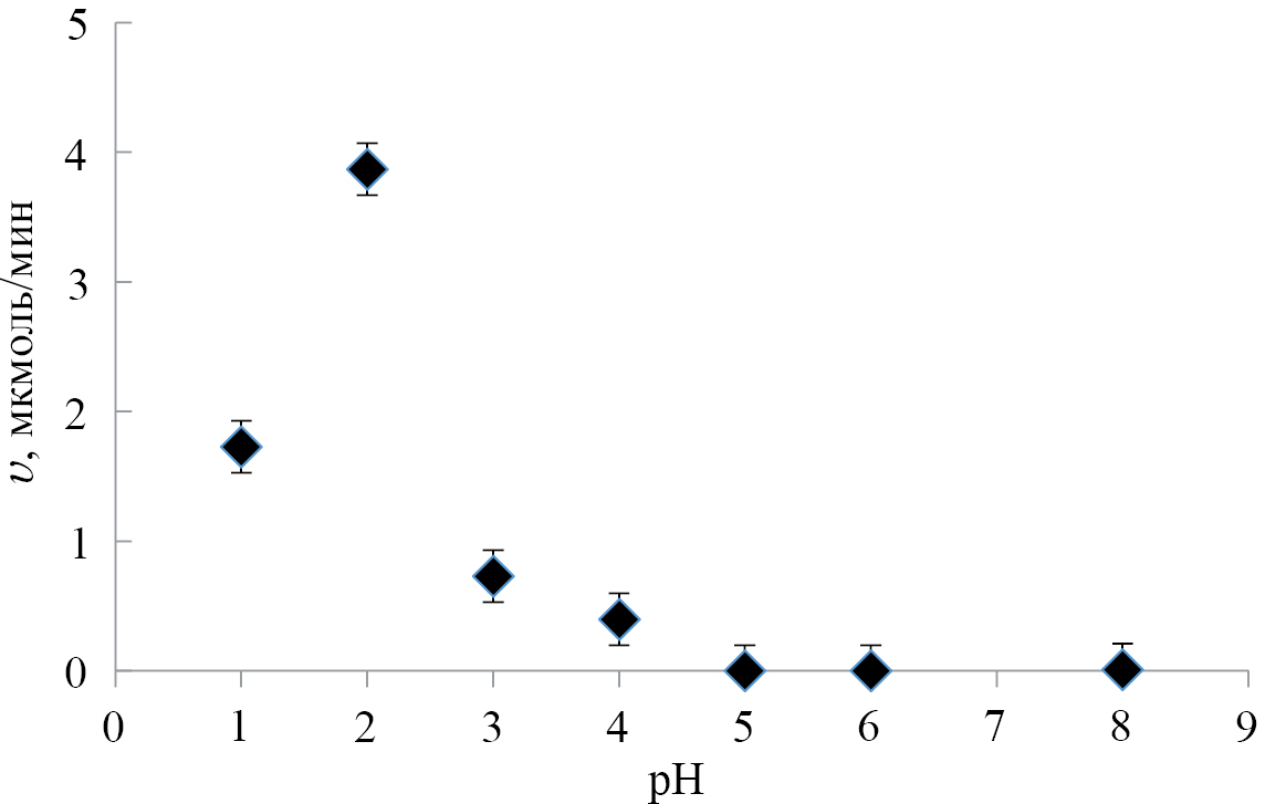 Для оптимизации эффективности фотокаталитического получения водорода из HCOOH исследовано влияние рН суспензии в интервале 1–8 на скорость процесса (рис. 6). Наибольшая активность наблюдается при рН = 2, что, вероятно, обусловлено оптимальным состоянием кислотно-оснóвных центров поверхности и субстрата для процесса адсорбции.