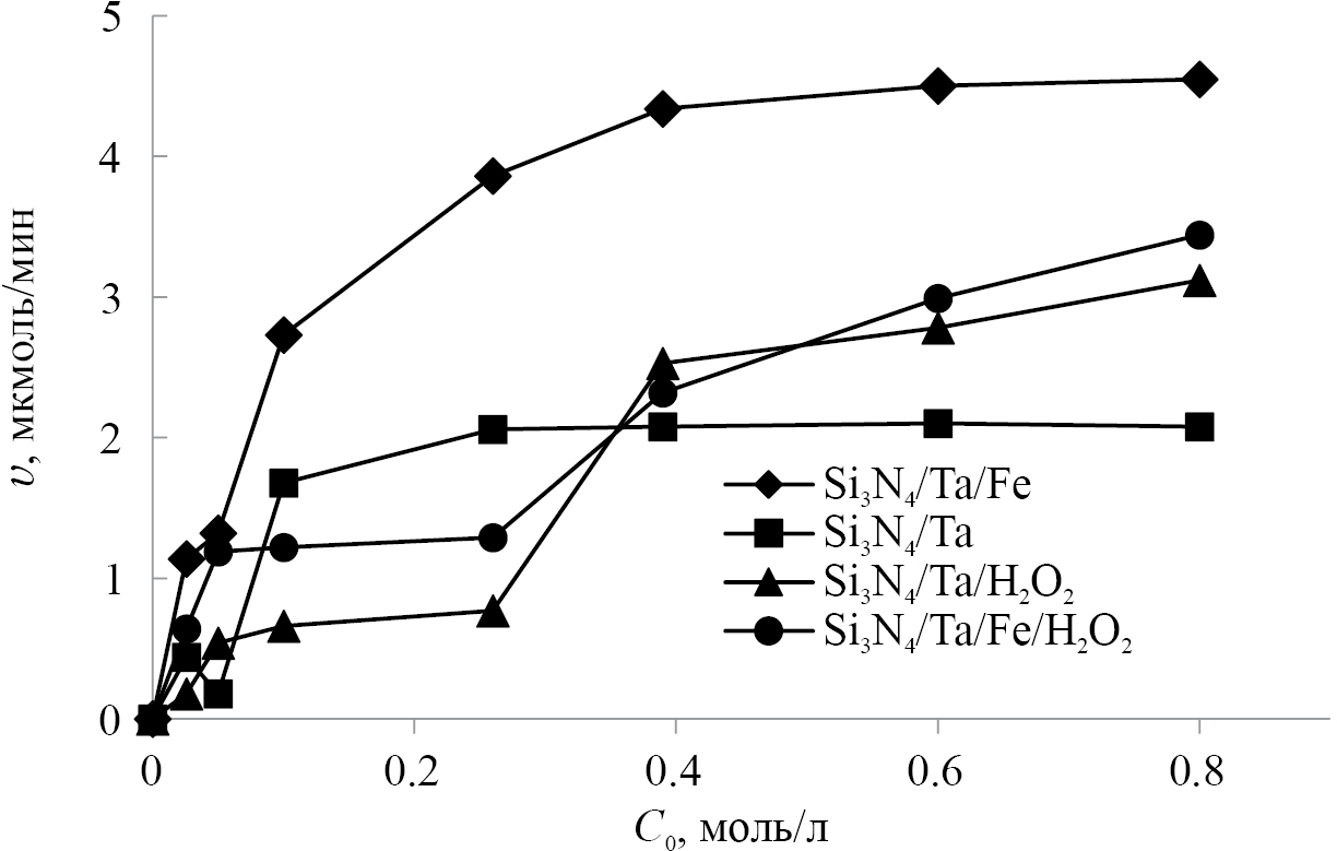 Для установления механизма фотокаталитического выделения водорода изучено влияние концентрации субстрата на скорость выделения H2 на композитах при оптимальном рН в отсутствие и с добавкой H2O2 (рис. 7). Наибольшая скорость выделения H2 из HCOOH зафиксирована в присутствии железосодержащего композита Si3N4/Ta/Fe без добавки H2O2. Это можно объяснить участием частично растворенного железа в фотокаталитическом процессе. Исследования фотохимии Fe(OH)2+ (рН = 2) показали [28], что Fe(OH)2+ подвергается относительно эффективной фотореакции с образованием Fe(II) и гидроксильного радикала: Fe(OH)2+ + hν → Fe2+ + ∙ОН. Таким образом, при облучении генерируется гидроксильный радикал, участвующий в окислении HCOOH.