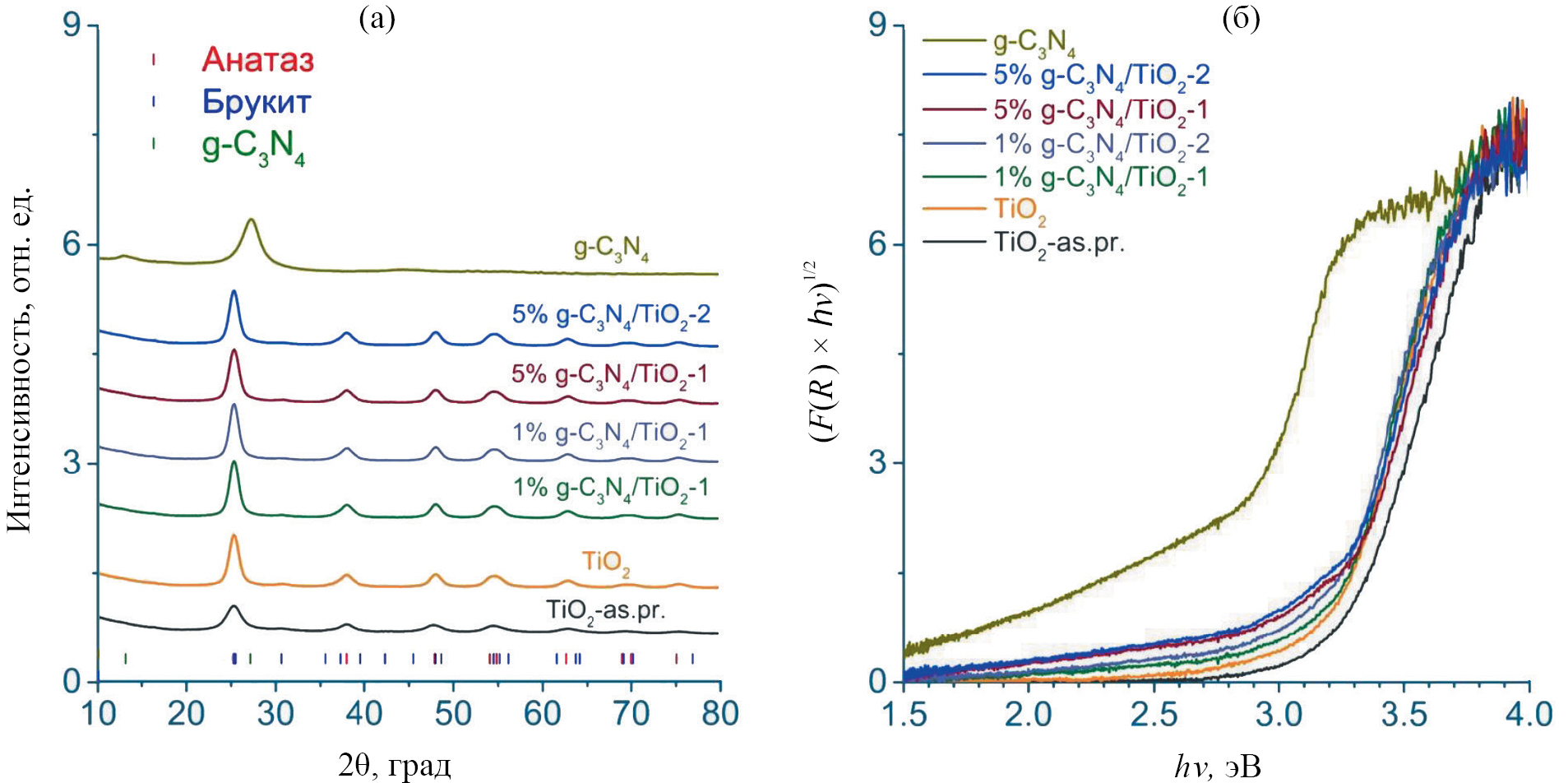 Рис. 1. Дифрактограммы (a) и график в координатах Тауца спектров отражения (б) фотокатализаторов TiO2-as.pr., TiO2, g-C3N4 и g-C3N4/TiO2.